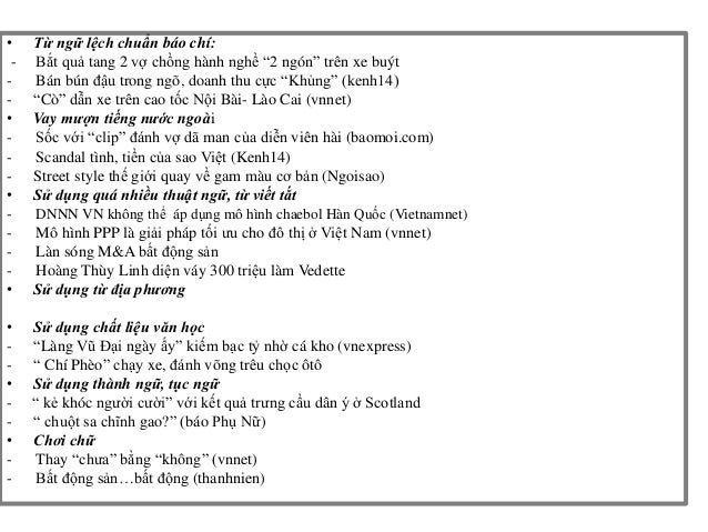 - 10. • Từ ngữ lệch chuẩn báo chí: - Bắt quả tang 2 vợ chồng hành nghề “2 ngón” trên xe buýt - Bán bún đậu trong ngõ, doanh thu cực “Khủng” (kenh14) - “Cò” dẫn xe trên cao tốc Nội Bài- Lào Cai (vnnet) • Vay mượn tiếng nước ngoài - Sốc với “clip” đánh vợ dã man của diễn viên hài (baomoi.com) - Scandal tình, tiền của sao Việt (Kenh14) - Street style thế giới quay về gam màu cơ bản (Ngoisao) • Sử dụng quá nhiều thuật ngữ, từ viết tắt - DNNN VN không thể áp dụng mô hình chaebol Hàn Quốc (Vietnamnet) - Mô hình PPP là giải pháp tối ưu cho đô thị ở Việt Nam (vnnet) - Làn sóng M&A bất động sản - Hoàng Thùy Linh diện váy 300 triệu làm Vedette • Sử dụng từ địa phương • Sử dụng chất liệu văn học - “Làng Vũ Đại ngày ấy” kiếm bạc tỷ nhờ cá kho (vnexpress) - “ Chí Phèo” chạy xe, đánh võng trêu chọc ôtô • Sử dụng thành ngữ, tục ngữ - “ kẻ khóc người cười” với kết quả trưng cầu dân ý ở Scotland - “ chuột sa chĩnh gao?” (báo Phụ Nữ) • Chơi chữ - Thay “chưa” bằng “không” (vnnet) - Bất động sản…bất động (thanhnien)