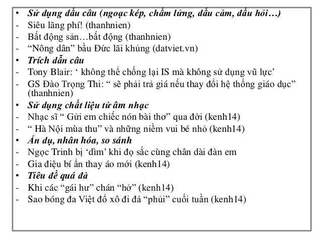 - 11. • Sử dụng dấu câu (ngoạc kép, chấm lửng, dấu cảm, dấu hỏi…) - Siêu lãng phí! (thanhnien) - Bất động sản…bất động (thanhnien) - “Nông dân” bầu Đức lãi khủng (datviet.vn) • Trích dẫn câu - Tony Blair: ‘ không thể chống lại IS mà không sử dụng vũ lực’ - GS Đào Trọng Thi: “ sẽ phải trả giá nếu thay đổi hệ thống giáo dục” (thanhnien) • Sử dụng chất liệu từ âm nhạc - Nhạc sĩ “ Gửi em chiếc nón bài thơ” qua đời (kenh14) - “ Hà Nội mùa thu” và những niềm vui bé nhỏ (kenh14) • Ẩn dụ, nhân hóa, so sánh - Ngọc Trinh bị ‘dìm’ khi đọ sắc cùng chân dài đàn em - Gia điệu bí ẩn thay áo mới (kenh14) • Tiêu đề quá đà - Khi các “gái hư” chán “hở” (kenh14) - Sao bóng đa Việt đổ xô đi đá “phủi” cuối tuần (kenh14)