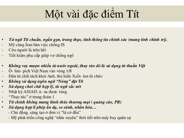 - 13. Một vài đặc điểm Tít • Từ ngữ Tít chuẩn, ngắn gọn, trung thực, tính thông tin chính xác (mang tính chính trị). - Mỹ cùng Ỉran bàn việc chống IS - Cứu người là trên hết - Tiết kiệm phụ cấp giúp vợ chống ngô • Không vay mượn nhiều từ nước ngoài, thay vào đó là sử dụng từ thuần Việt - Ô- lim- pich Việt Nam vào vòng 1/8 - Dân từ chối tách khỏi Anh, thủ hiến Xcốt- len từ chức • Không sử dụng ngôn ngữ “Nóng” đặt Tít • Sử dụng chơi chữ hợp lý, từ ngữ sắc nét - Nhật ký ASIAD: ủ- su được vàng - “Thực túc” ở trung đoàn 1 • Tít chính không mang hình thức thương mại ( quảng cáo, PR) • Sử dụng hợp lí phép ẩn dụ, so sánh, nhân hóa… - Chủ động, sáng tạo ở đơn vị “lá cờ đầu” - Mỹ phát triển công nghệ “nhìn xuyên” thời tiết trên máy bay quân sự