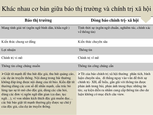 - 14. Khác nhau cơ bản giữa báo thị trường và chính trị xã hội Báo thị trường Dòng báo chính trị- xã hội Mang tính giải trí (ngôn ngữ bình dân, khẩu ngữ ) Tính thời sự (ngôn ngữ chuẩn, nghiêm túc, chính xác về thông tin) Kiến thức chung sơ đẳng Kiến thức chuyên sâu Lợi nhuận Thông tin Chính trị vi mô Chính trị vĩ mô Thông tin công chúng muốn Thông tin công chúng cần ¬Giật tít mạnh để thu hút độc giả, thu hút quảng cáo, các dự án truyền thông. Nội dung trong bài thường không đáp ứng được nội dung của tít báo. Kiểu đặt tít thường dùng các con số để nhấn mạnh, cấu trúc bỏ lửng tạo sự tò mò cho độc giả, dùng các câu hỏi, dùng các đơn vị ngôn ngữ dân gian (ca dao, tục ngữ…), ví von nhằm kích thích độc giả muốn đọc… các bài báo giật tít mạnh thường gây được sự chú ý của độc giả, câu dự án truyền thông. ¬Tít của báo chính trị xã hội thường phân tích, bình luận chuyên sâu, đi thẳng ngay vào vấn đề thời sự chính trị- XH, dễ hiểu, gần gũi với thông tin được phản ánh trong bài, phản ánh trung thực những tin tức, sự kiện diễn ra nhằm cung cấp thông tin cho dư luận không có mục đích câu view.