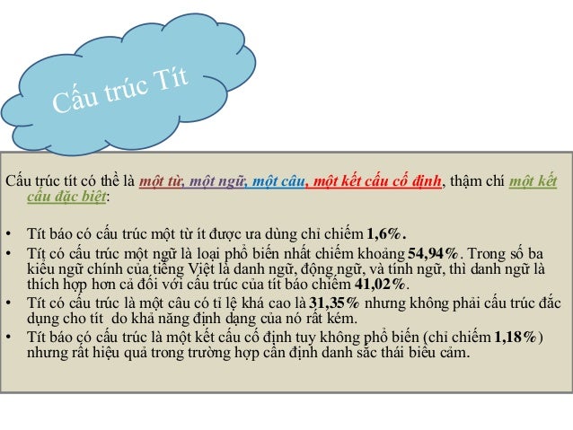 – Tít có cấu trúc là một câu có tỉ lệ khá cao là 31,35% nhưng không phải cấu trúc đắc dụng cho tít do khả năng định dạng của nó rất kém.