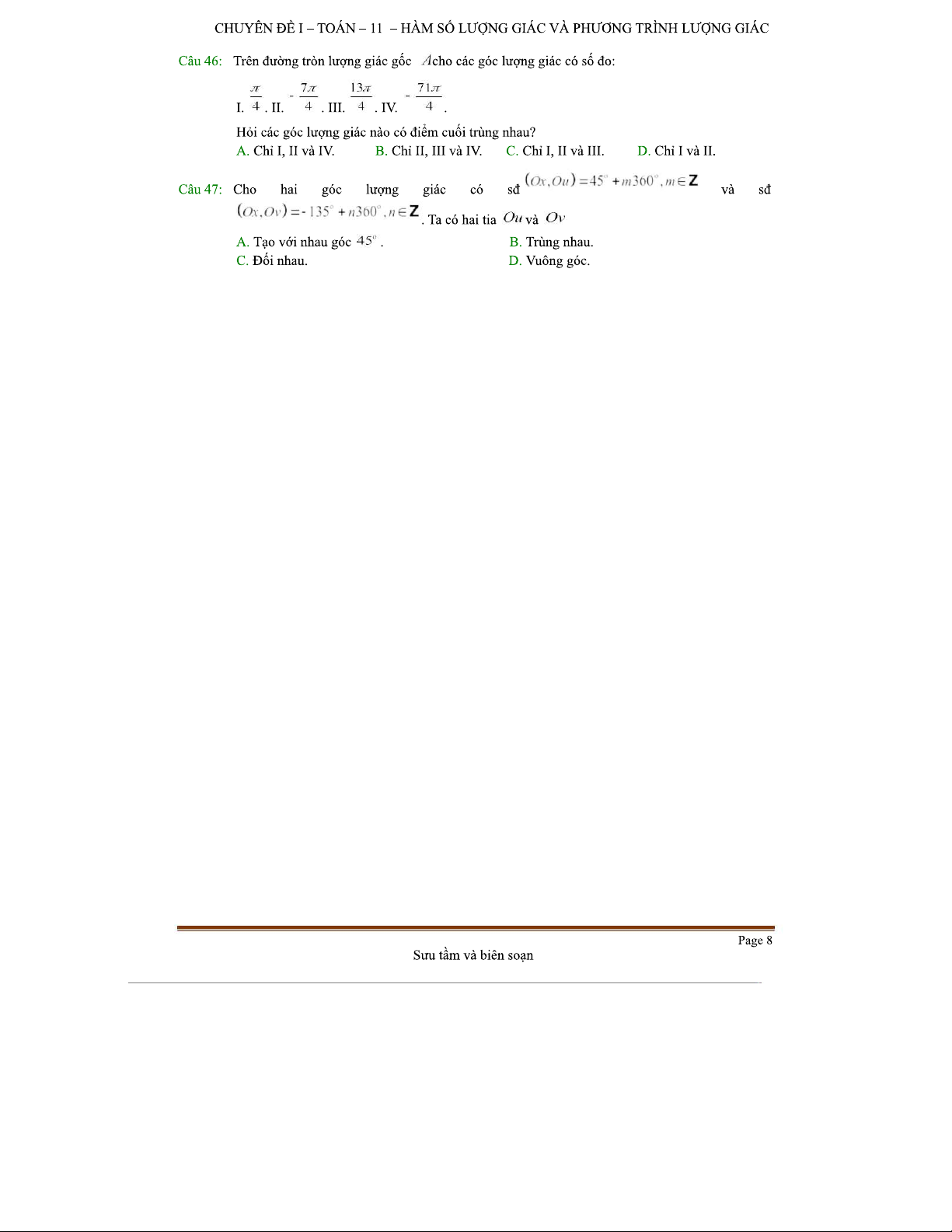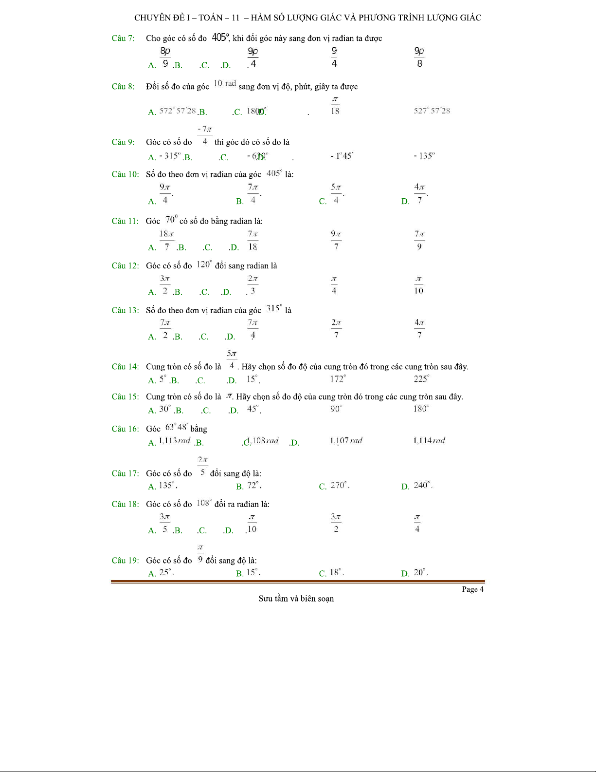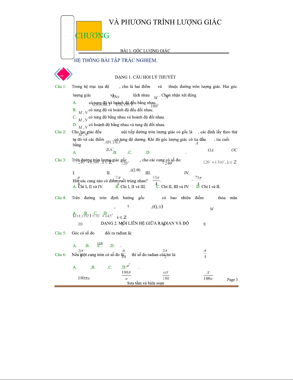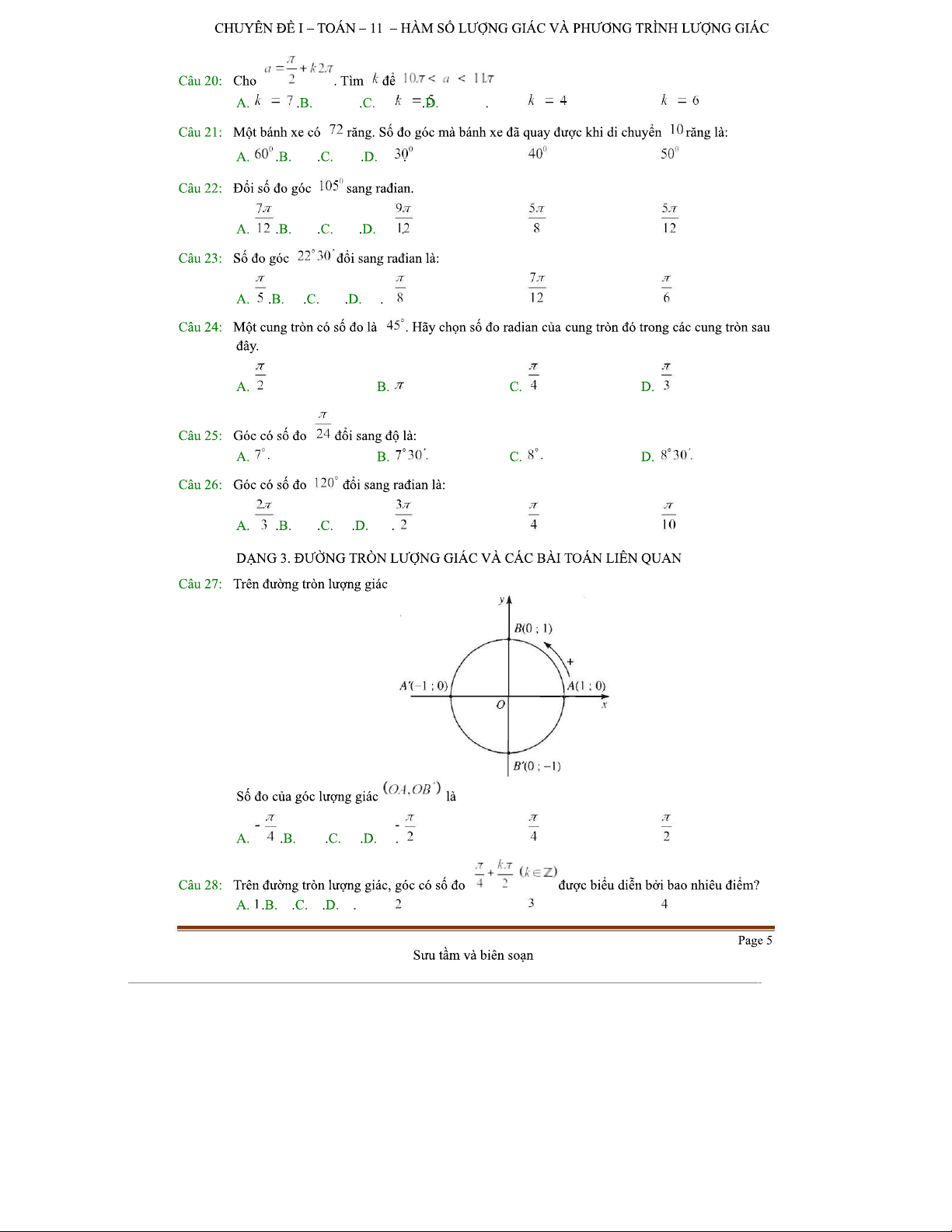 TOAN-11 C1 B1: Đề Kiểm Tra Lý Thuyết Góc Lượng Giác