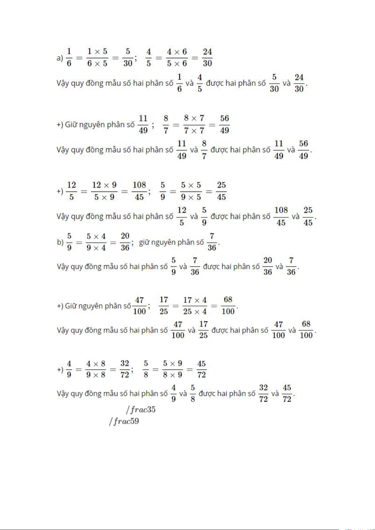 - Lấy tử số và mẫu số của phân số thứ hai nhân với mẫu số của phân số thứ nhất. Lời giải: