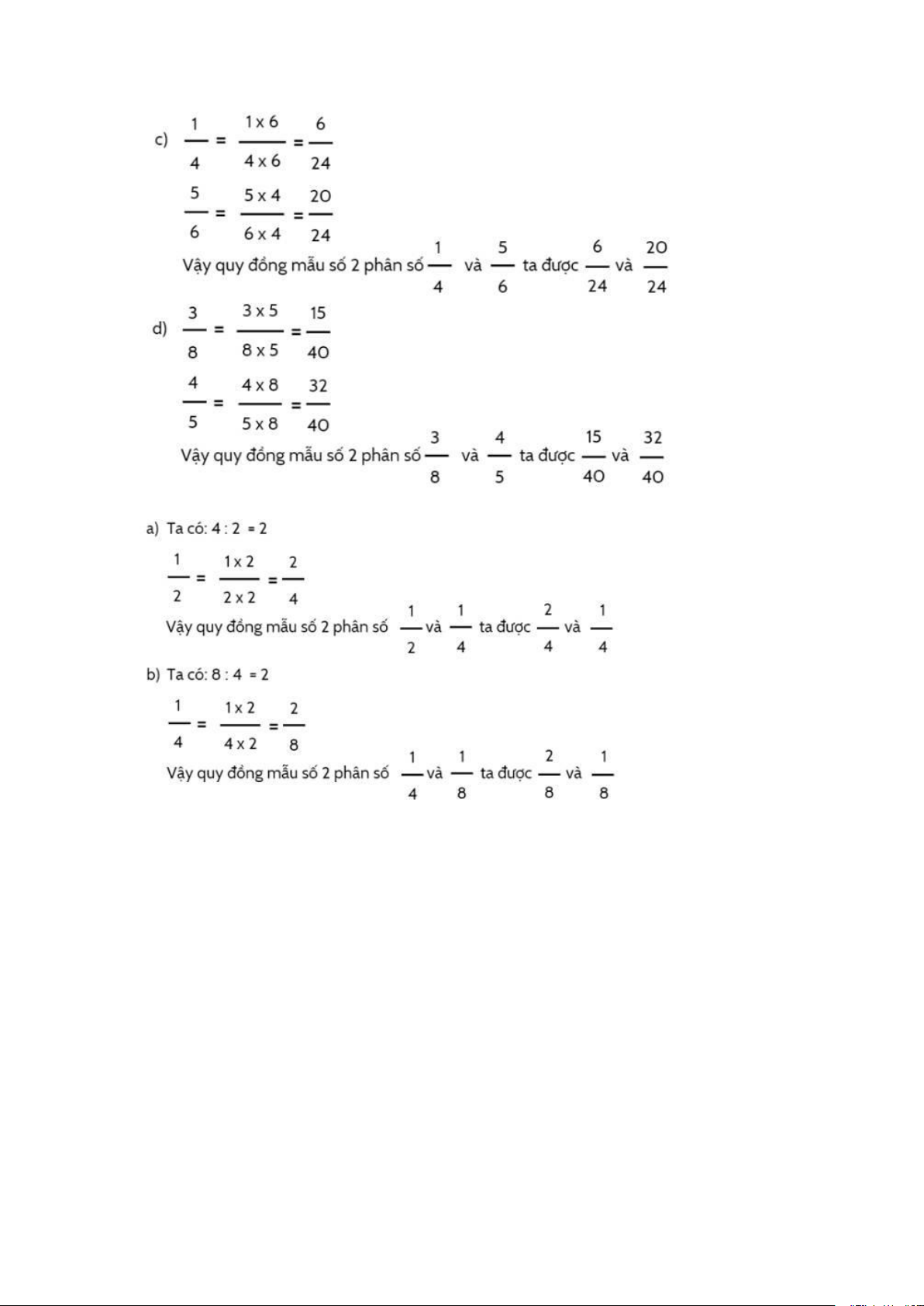 b) Chọn mẫu số chung là 24 (vì 24 chia hết cho 3, 4, 8). Sau khi quy đồng mẫu số ta được: