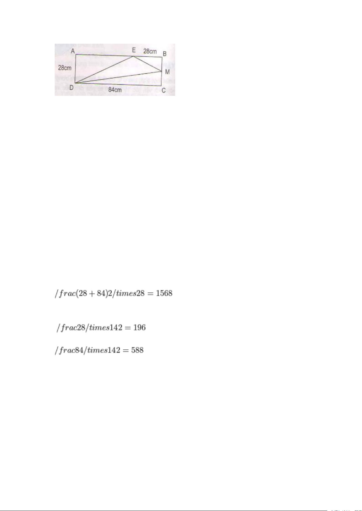 Diện tích hình tam giác EDM là: Shình thang– (SEBM + SDMC) = 1568 – (196 + 588) = 784 (cm2)
