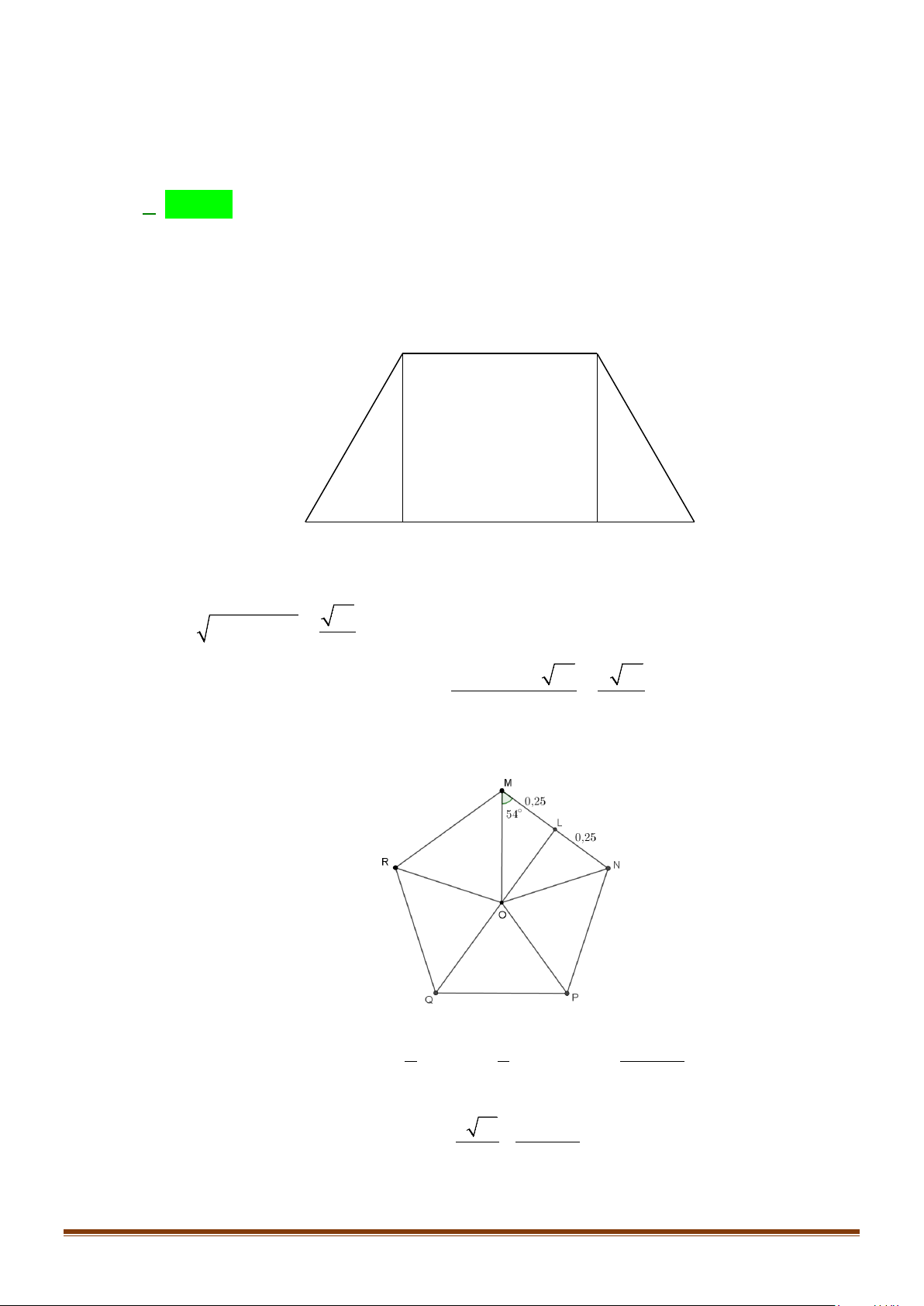 Giả sử đáy nhỏ là ngũ giác đều MNPQR . Gọi O là tâm của ngũ giác đều, L là trung điểm MN . Ta có 5 5 2 5tan 54 S = S = OL MN = = m . MNPQR 5 MON . . .tan 54 .0,5 ( 2) 2 4 16