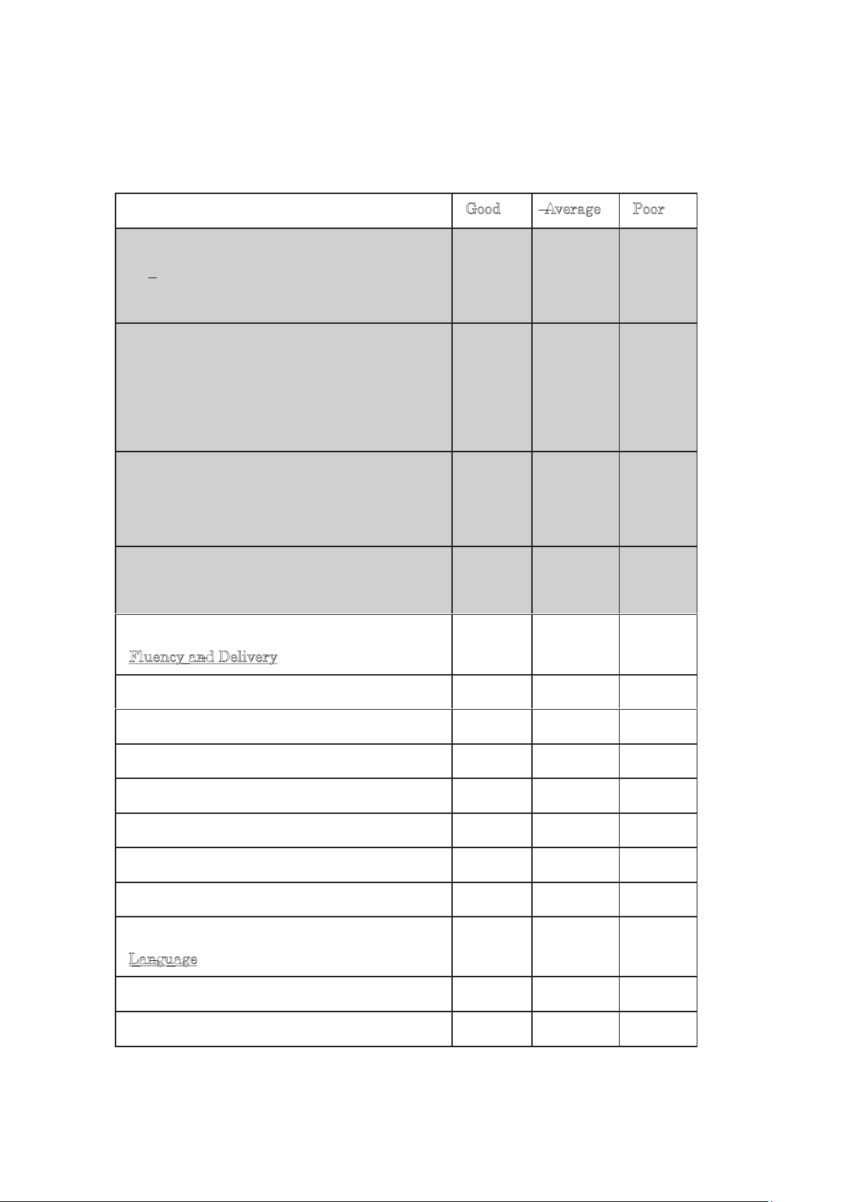 Evidence and explanation to support main points Consideration of audience Appropriate length Fluency and Delivery Eye contact Voice projection/ tone Gesture/ movement/ posture Pace/ Use of pause Pronunciation/ Intonation Use of visuals Use of notes Language Vocabulary Grammar