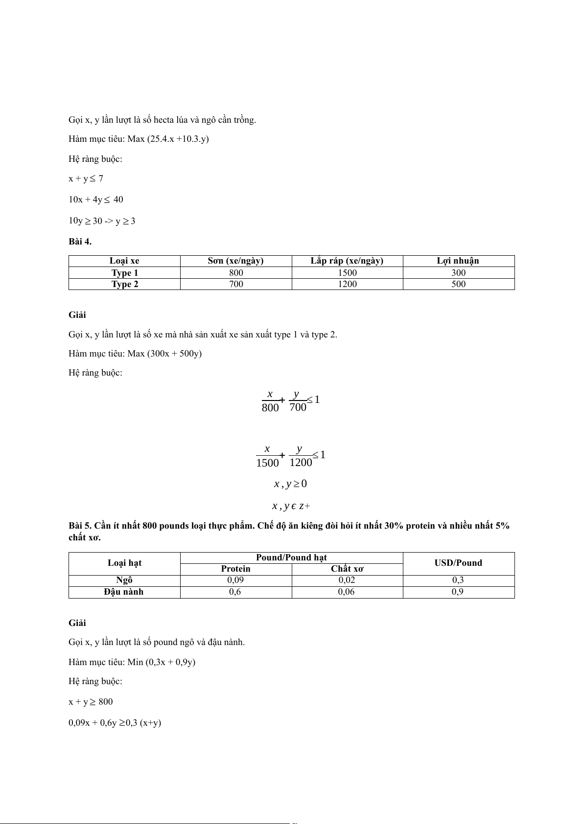 Bài 5. Cần ít nhất 800 pounds loại thực phẩm. Chế độ ăn kiêng đòi hỏi ít nhất 30% protein và nhiều nhất 5% chất xơ. Pound/Pound hạt Loại hạt USD/Pound Protein Chất xơ Ngô 0,09 0,02 0,3 Đậu nành 0,6 0,06 0,9 Giải