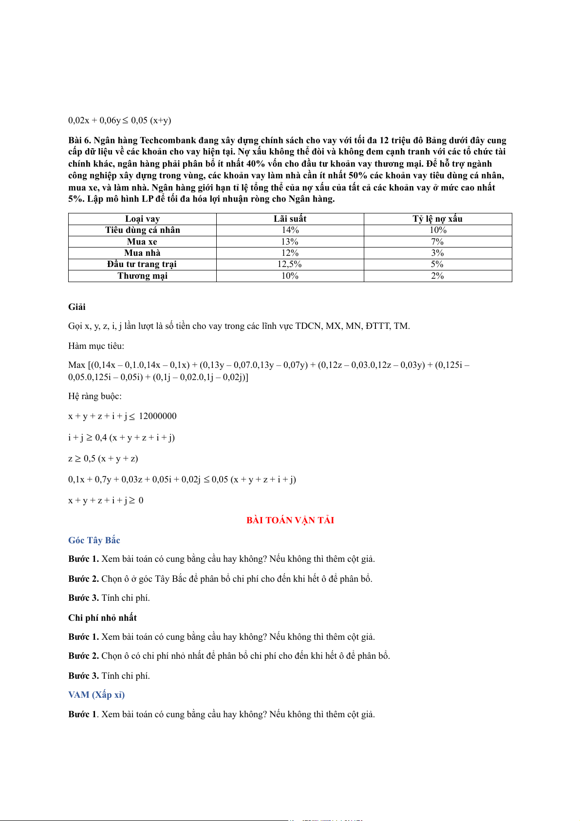 Gọi x, y, z, i, j lần lượt là số tiền cho vay trong các lĩnh vực TDCN, MX, MN, ĐTTT, TM. Hàm mục tiêu:
