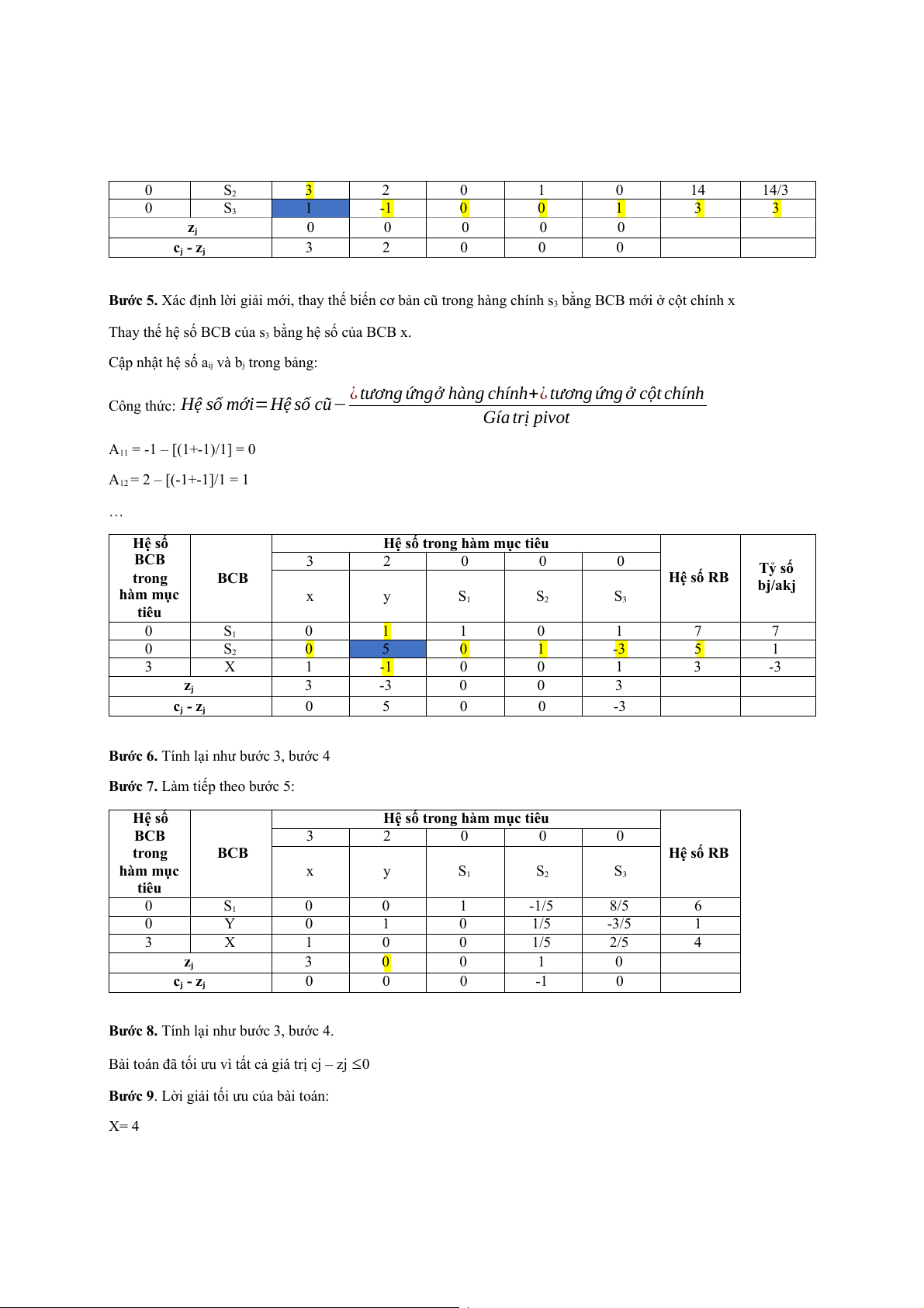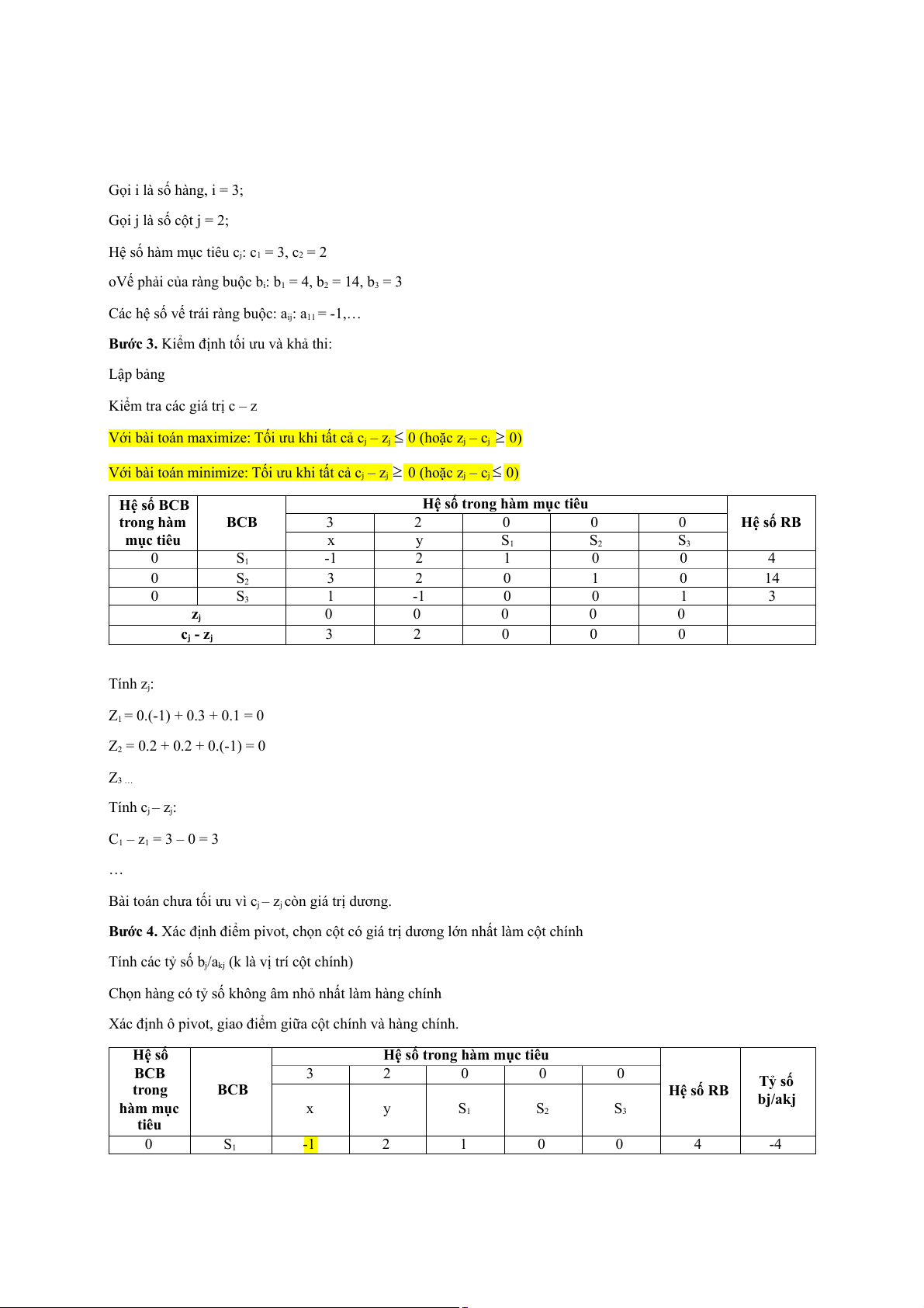 Hệ số trong hàm mục tiêu BCB 3 2 0 0 0 trong BCB Hệ số RB hàm mục x y S1 S2 S3 tiêu 0 S1 0 0 1 -1/5 8/5 6 0 Y 0 1 0 1/5 -3/5 1 3 X 1 0 0 1/5 2/5 4 zj 3 0 0 1 0 cj - zj 0 0 0 -1 0