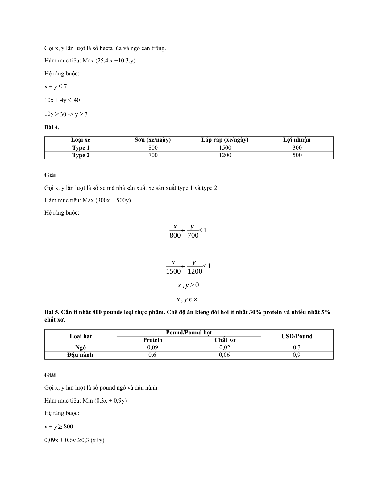10y ≥ 30 -> y ≥ 3 Bài 4. Loại xe Sơn (xe/ngày) Lắp ráp (xe/ngày) Lợi nhuận Type 1 800 1500 300 Type 2 700 1200 500 Giải