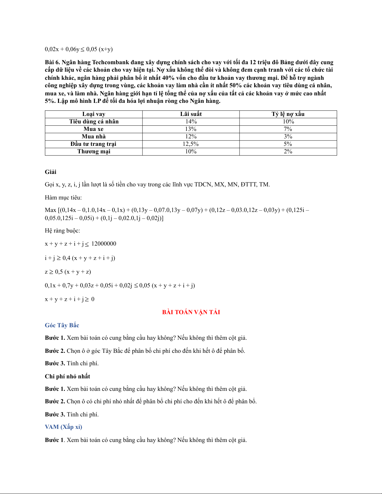 Bài 6. Ngân hàng Techcombank đang xây dựng chính sách cho vay với tối đa 12 triệu đô Bảng dưới đây cung