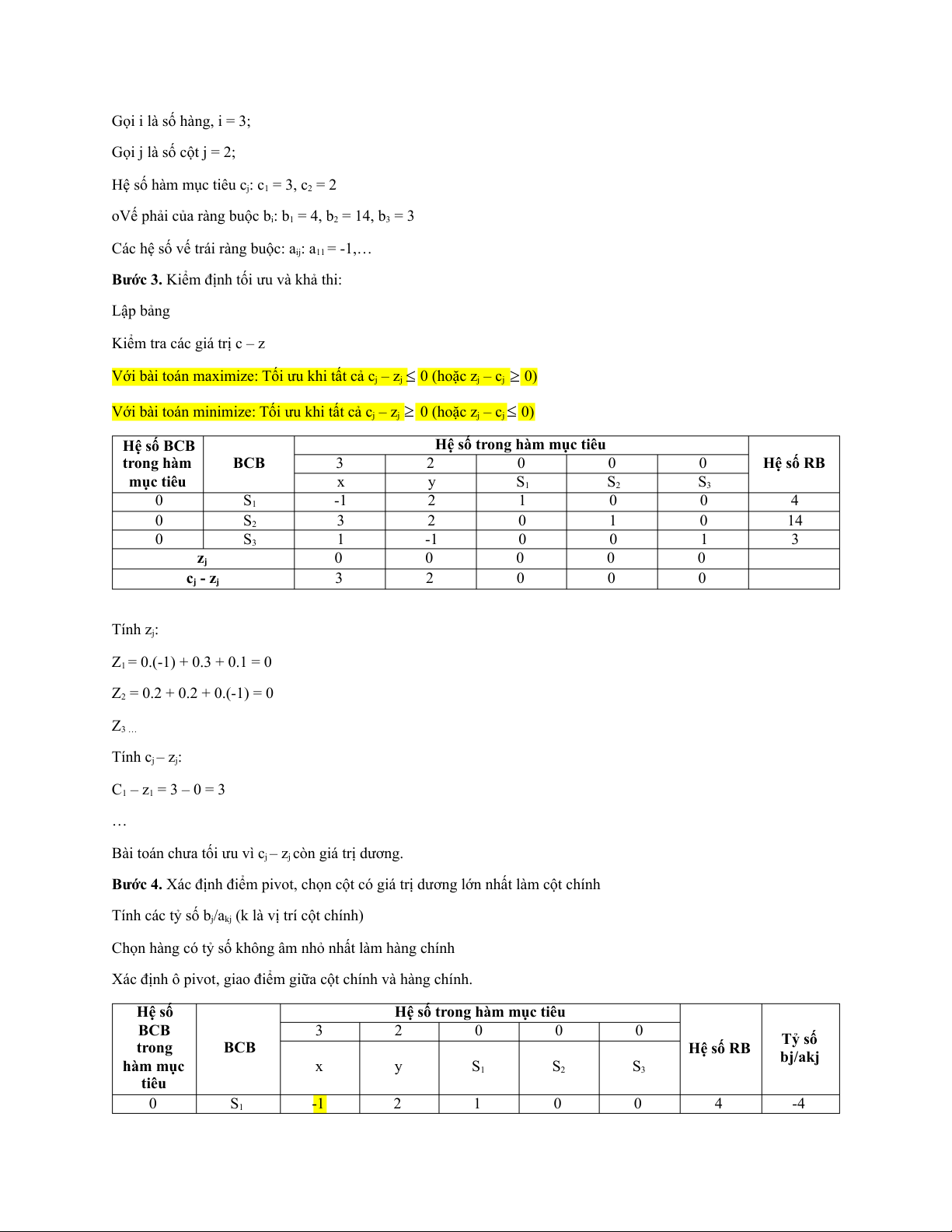 Hệ số trong hàm mục tiêu trong hàm BCB 3 2 0 0 0 Hệ số RB mục tiêu x y S1 S2 S3 0 S1 -1 2 1 0 0 4 0 S2 3 2 0 1 0 14 0 S3 1 -1 0 0 1 3 zj 0 0 0 0 0 cj - zj 3 2 0 0 0 Tính zj: Z1 = 0.(-1) + 0.3 + 0.1 = 0 Z2 = 0.2 + 0.2 + 0.(-1) = 0 Z3 … Tính cj – zj: C1 – z1 = 3 – 0 = 3 …