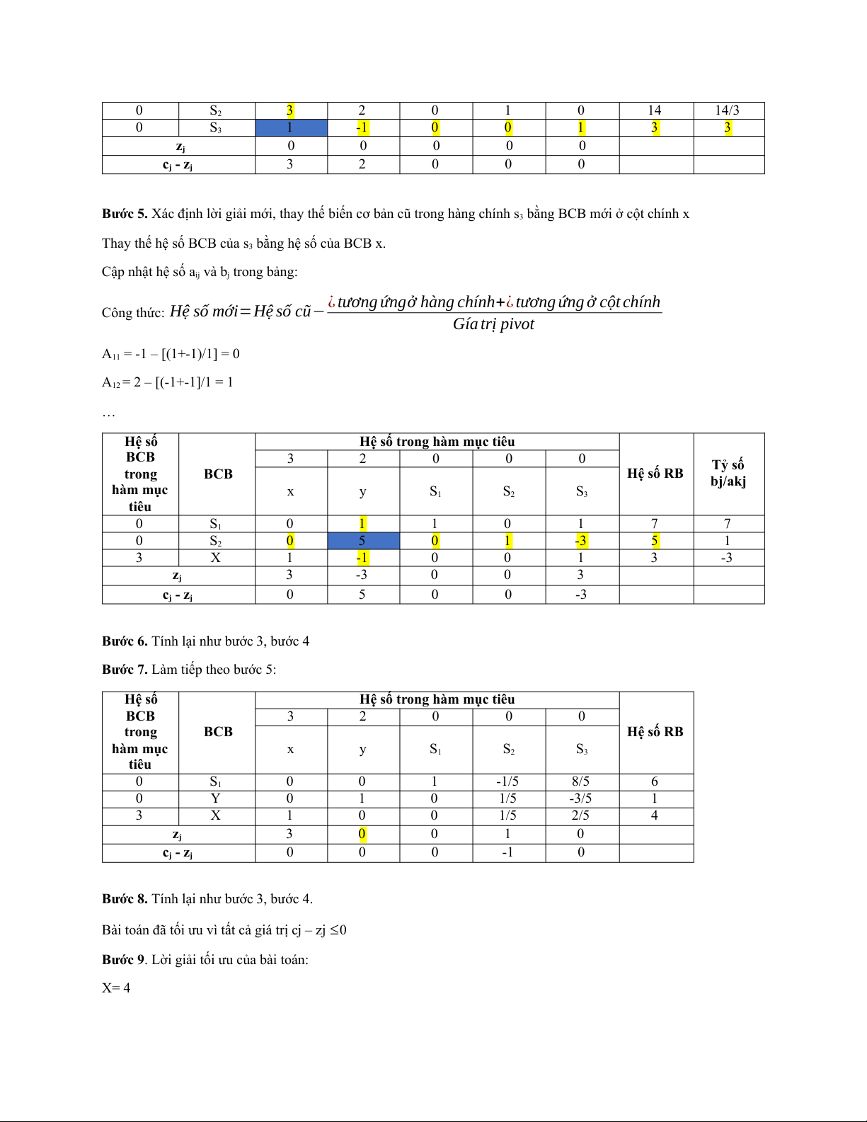 Hệ số trong hàm mục tiêu BCB 3 2 0 0 0 trong BCB Hệ số RB hàm mục x y S1 S2 S3 tiêu 0 S1 0 0 1 -1/5 8/5 6 0 Y 0 1 0 1/5 -3/5 1 3 X 1 0 0 1/5 2/5 4 zj 3 0 0 1 0 cj - zj 0 0 0 -1 0