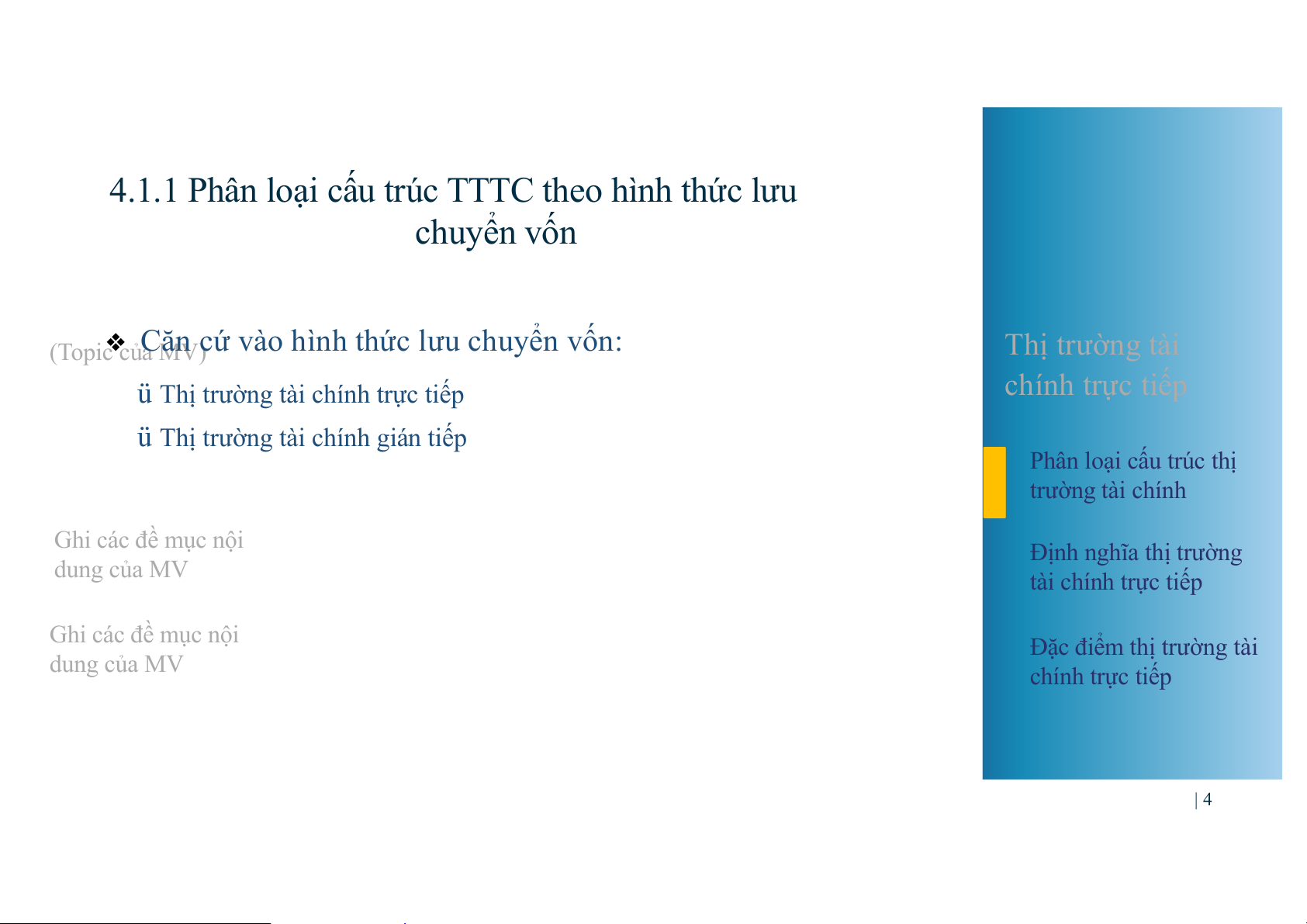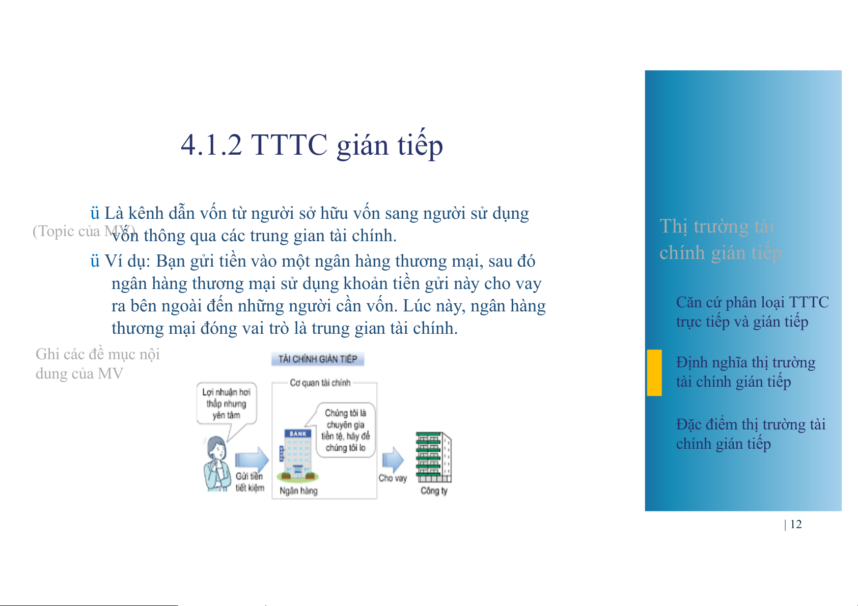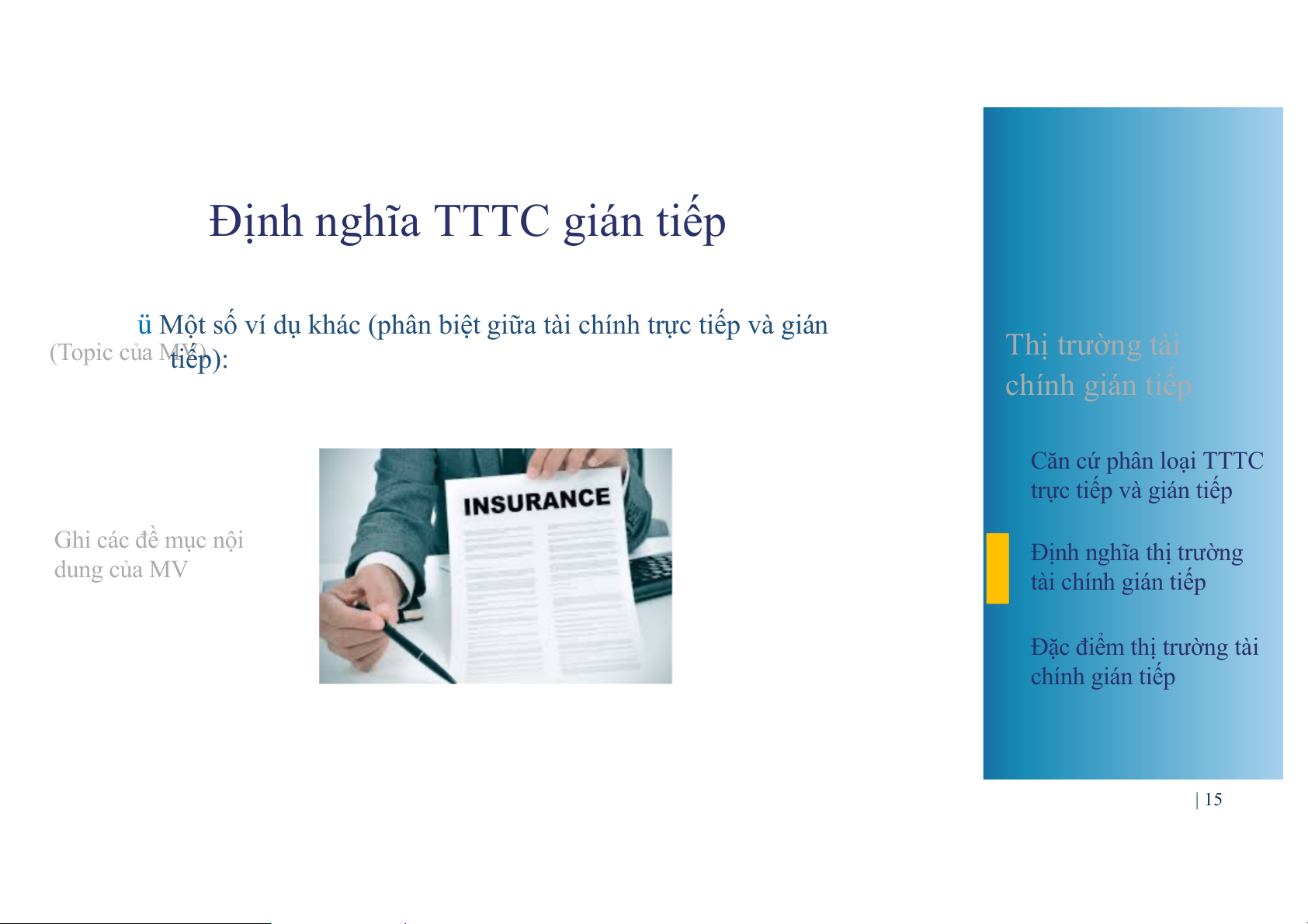 ü Một số ví dụ khác (phân biệt giữa tài chính trực tiếp và gián (Topic của MV) tiếp): Thị trường tài chính gián tiếp Căn cứ phân loại TTTC trực tiếp và gián tiếp Ghi các đề mục nội