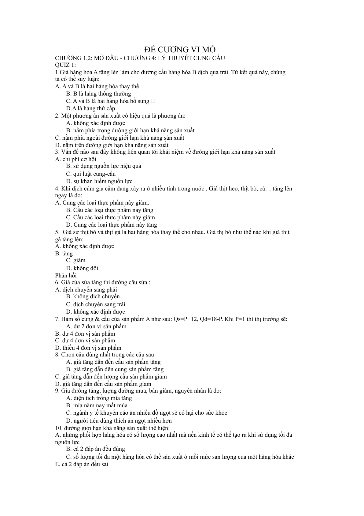 CHƯƠNG 1,2: MỞ ĐẦU - CHƯƠNG 4: LÝ THUYẾT CUNG CẦU QUIZ 1: