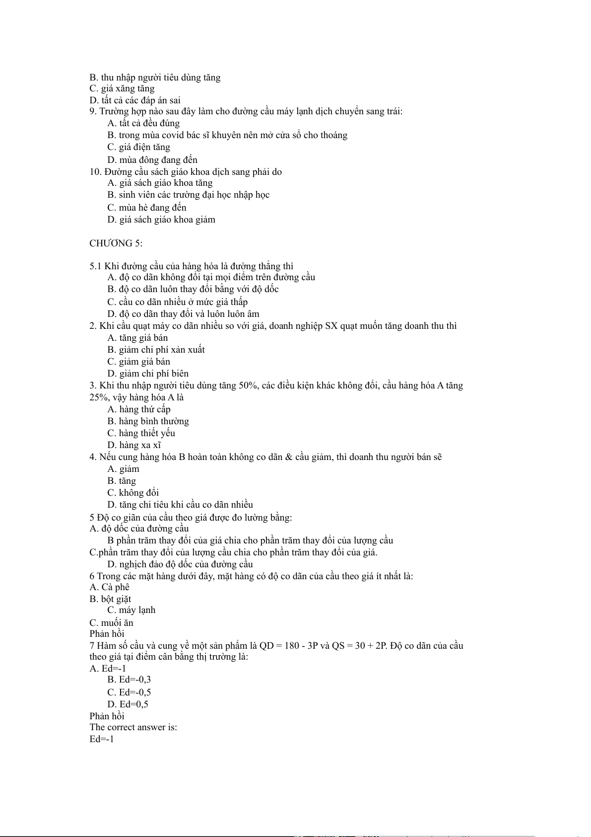 1.Một mặt hàng X, khi P là 5 thì lượng cầu là 10; khi giá tăng lên 7 thì lượng cầu là 8. Vậy hàm cầu của X là: A. Qd=P-15 B. Qd=-P+15 C. P=Q+15 D. P=Q-15
