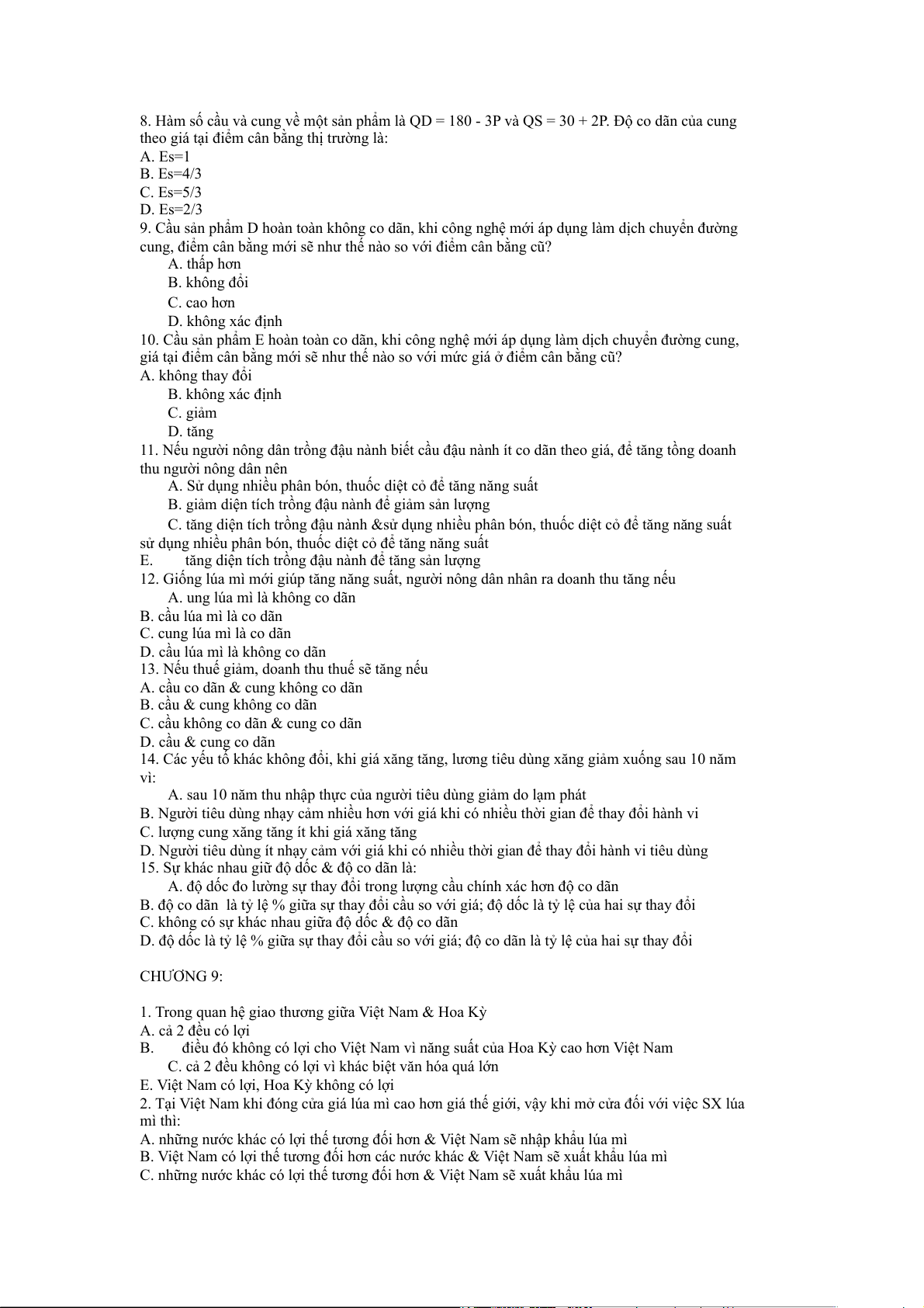 8. Hàm số cầu và cung về một sản phẩm là QD = 180 - 3P và QS = 30 + 2P. Độ co dãn của cung