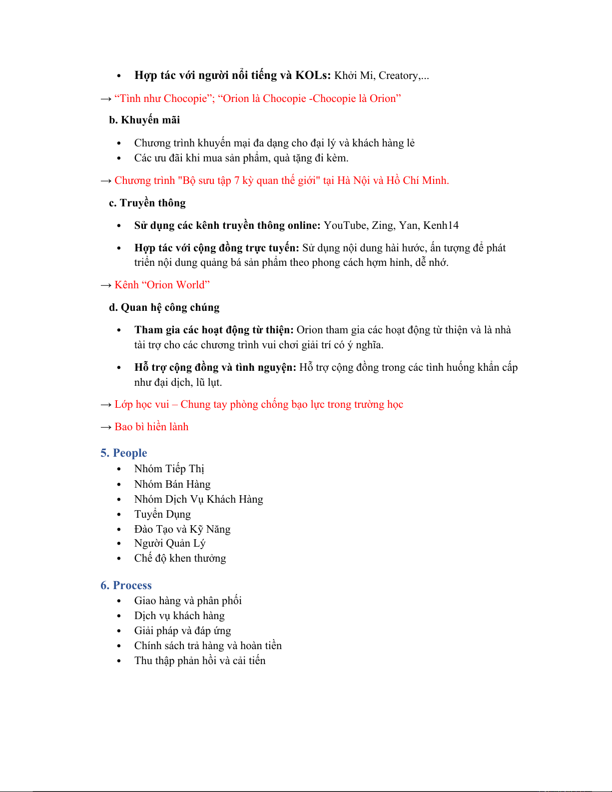 → Bao bì hiền lành 5. People Nhóm Tiếp Thị Nhóm Bán Hàng Nhóm Dịch Vụ Khách Hàng Tuyển Dụng Đào Tạo và Kỹ Năng Người Quản Lý Chế độ khen thưởng 6. Process Giao hàng và phân phối Dịch vụ khách hàng Giải pháp và đáp ứng