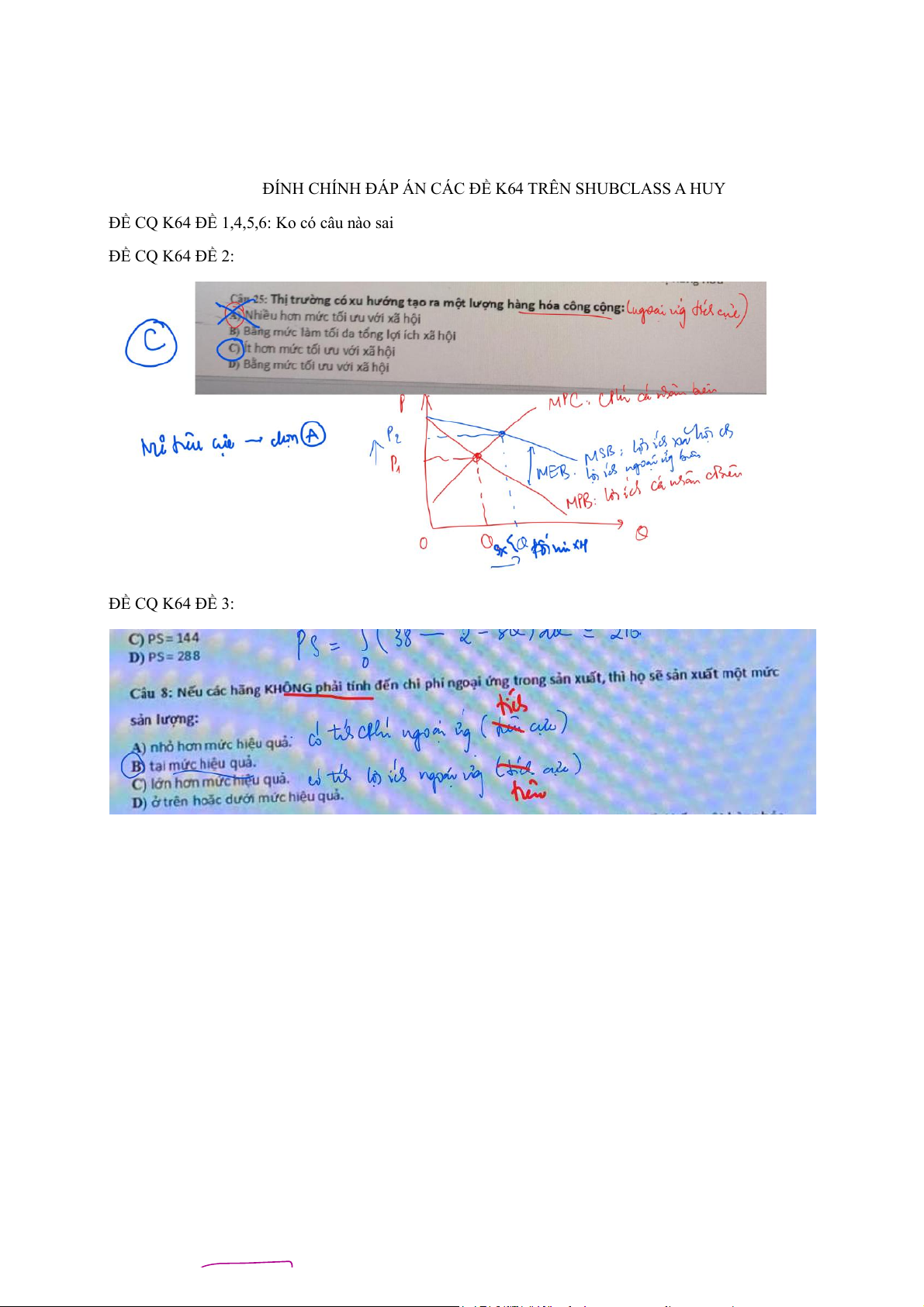 ĐÍNH CHÍNH ĐÁP ÁN CÁC ĐỀ K64 TRÊN SHUBCLASS A HUY