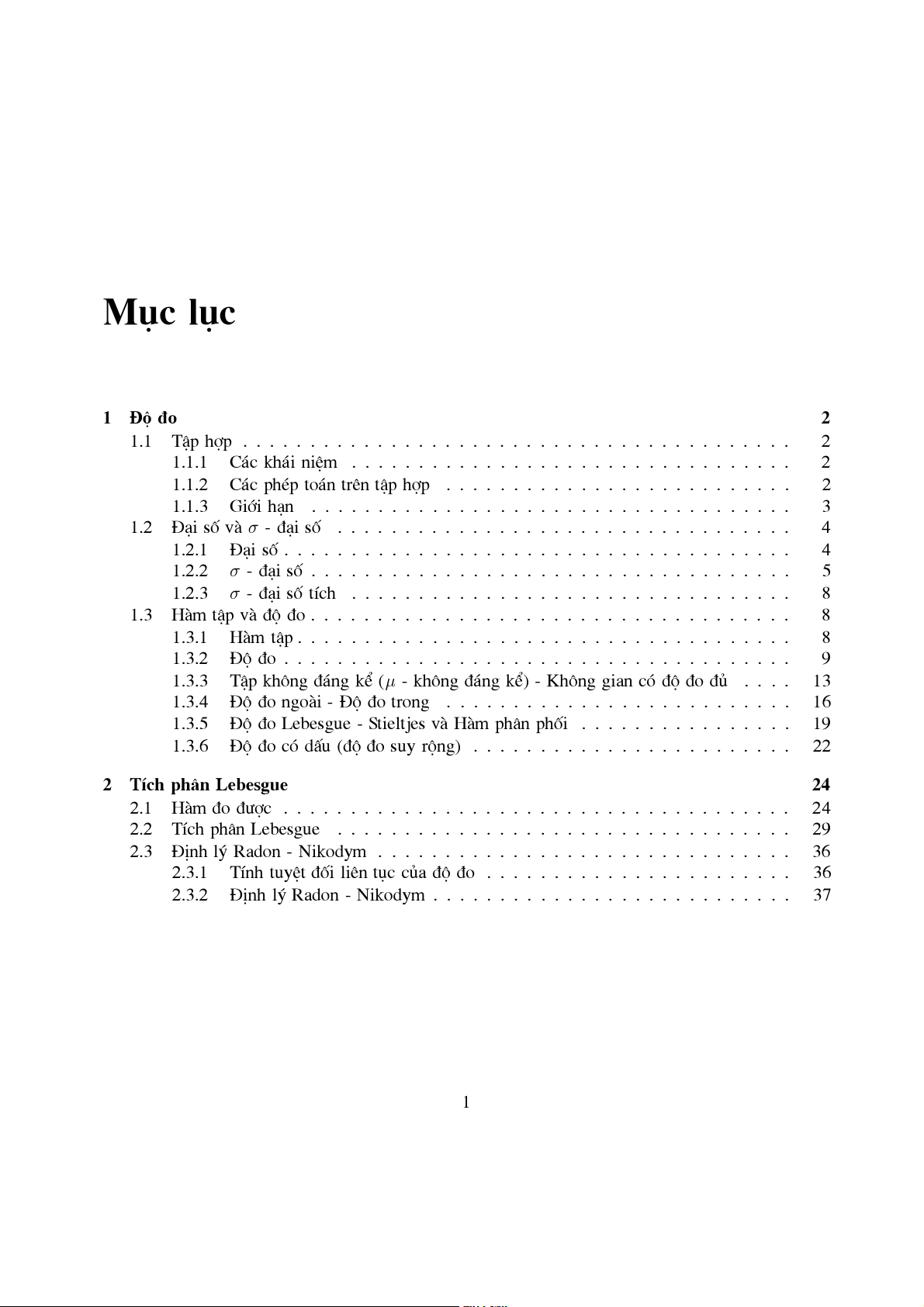 §Þnh lý Radon - Nikodym . . . . . . . . . . . . . . . . . . . . . . . . . . . 37 1 Ch−¬ng 1 §é ®o 1.1 TËp hîp 1.1.1 C¸c kh¸i niÖm