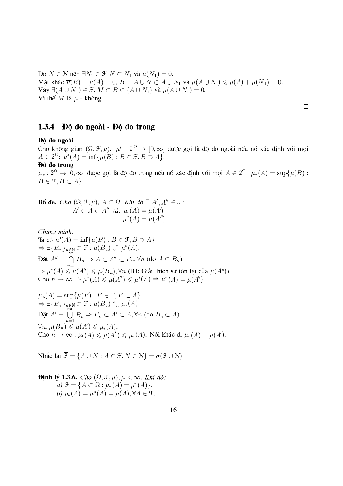 Ta cã µ∗(A) = inf{µ(B) : B ∈ F, B ⊃ A} ⇒ ∃{Bn }n∈ ⊂ F : µ(B N n) ↓n µ∗ ( ) A . ∞