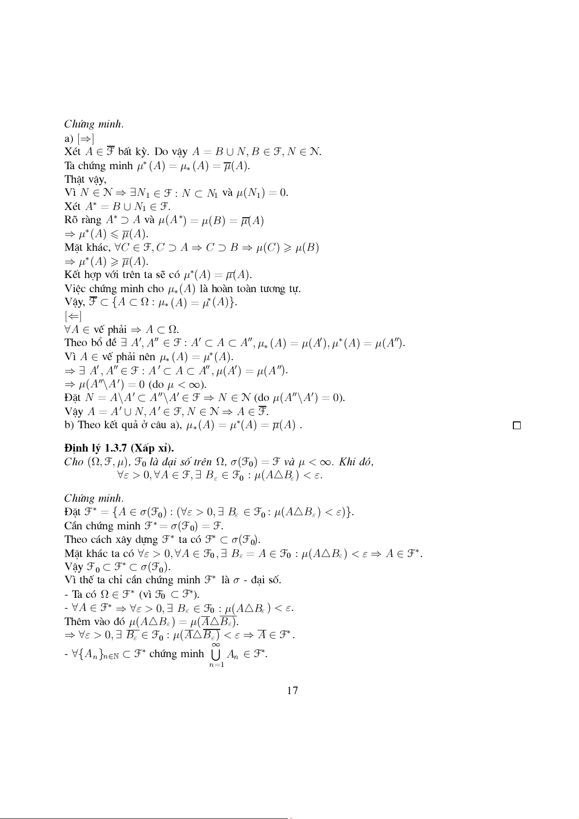 b) Theo kÕt qu¶ ë c©u a), µ∗(A) = µ∗(A) = ( µ A) . §Þnh lý 1.3.7 (XÊp xØ).