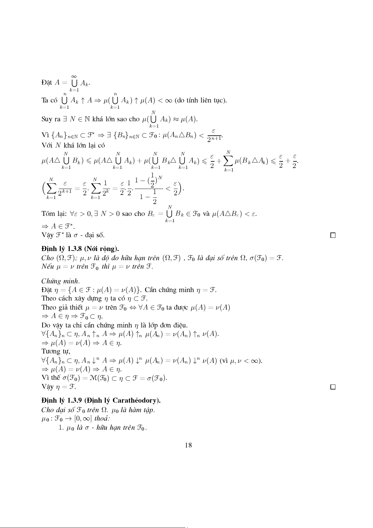 V× {An}n∈N ⊂ F∗ ⇒ ∃ {Bn}n∈N ⊂ F0 : µ(AnBn) < . 2 n+1 Víi N kh¸ lín l¹i cã N N N N N ε ε ε µ(A B k ) µ(A Ak) + ( µ Bk Ak) + µ(B k Ak) + . k=1 k=1 k=1 k=1 2 2 2 k=1 1 N N 1 − ( )N ε ε 1 ε 1 ε = . = . . 2 < . 2 k+1 2 2k 2 2 1 2 k=1 k=1 1 − 2 N