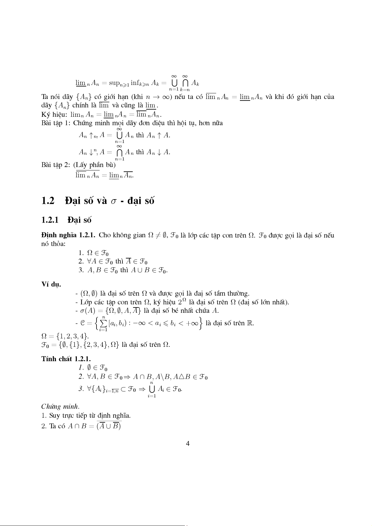 Bµi tËp 1: Chøng minh mäi dQy ®¬n ®iÖu th× héi tô, h¬n n÷a ∞ A n ↑ n, A = An th× An ↑ A. n=1 ∞ A n ↓ n, A = An th× An ↓ A. n=1 Bµi tËp 2: (LÊy phÇn bï) lim nAn = limnAn. 1.2 §¹i sè vµ σ - ®¹i sè 1.2.1 §¹i sè