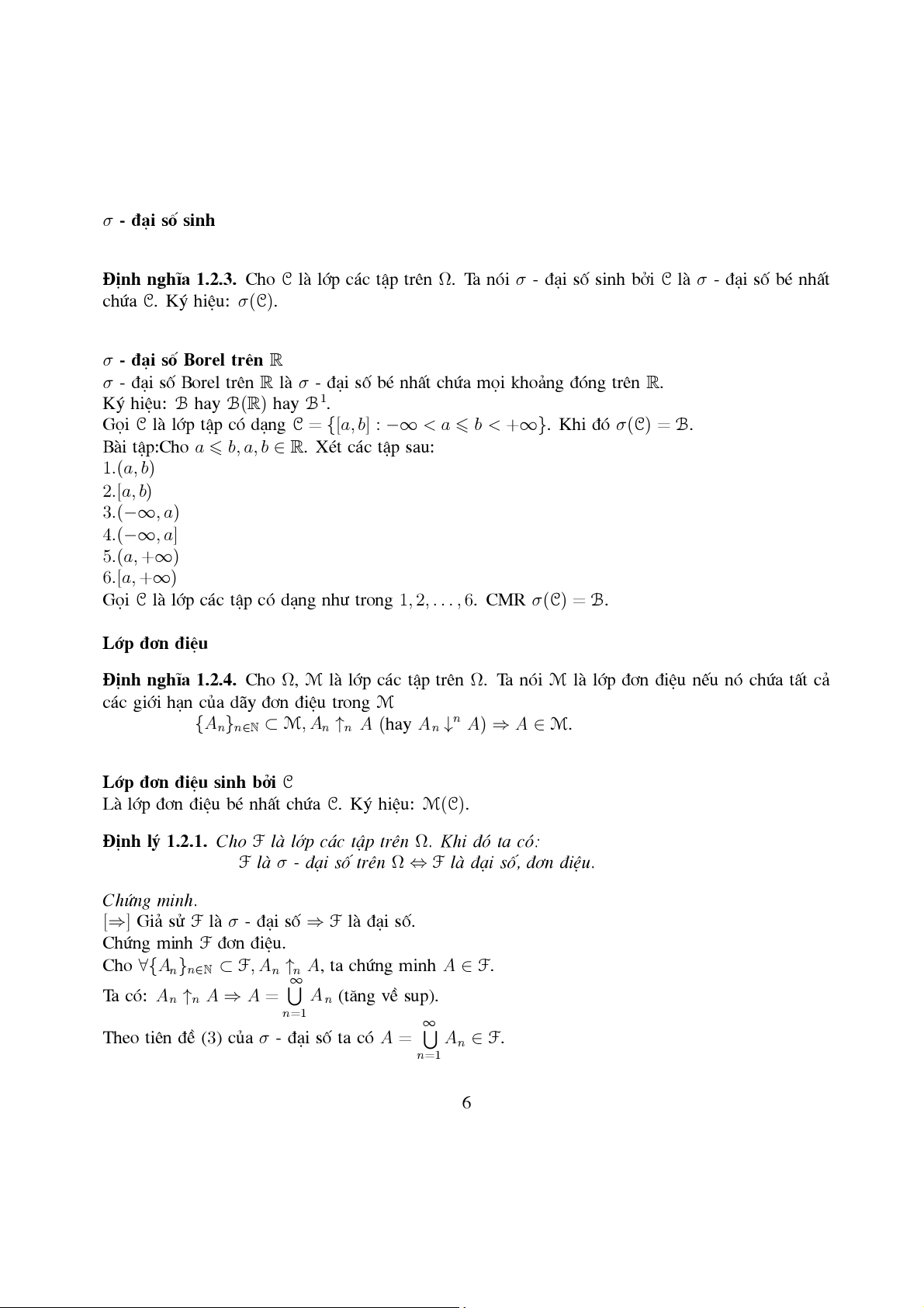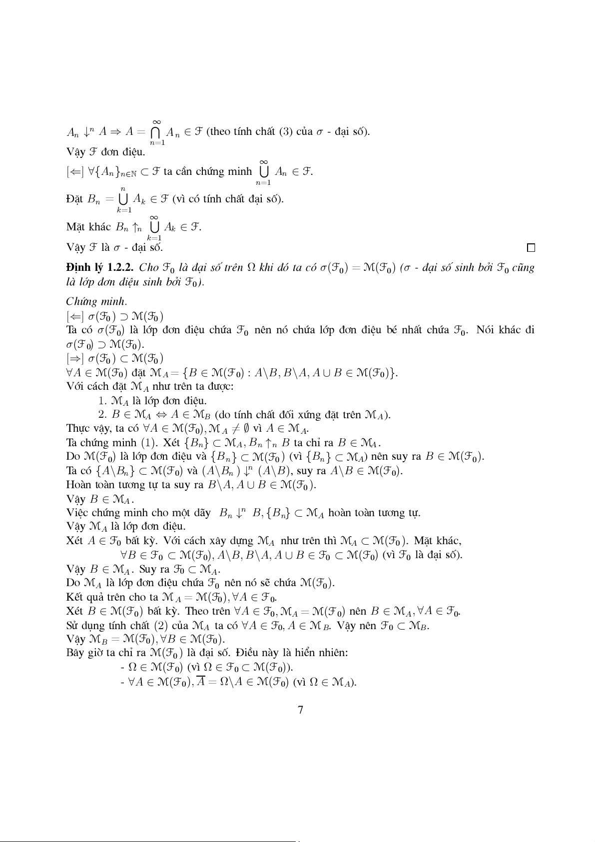 F lµ σ - ®¹i sè trªn Ω ⇔ F lµ ®¹i sè, ®¬n ®iÖu. Chøng minh.
