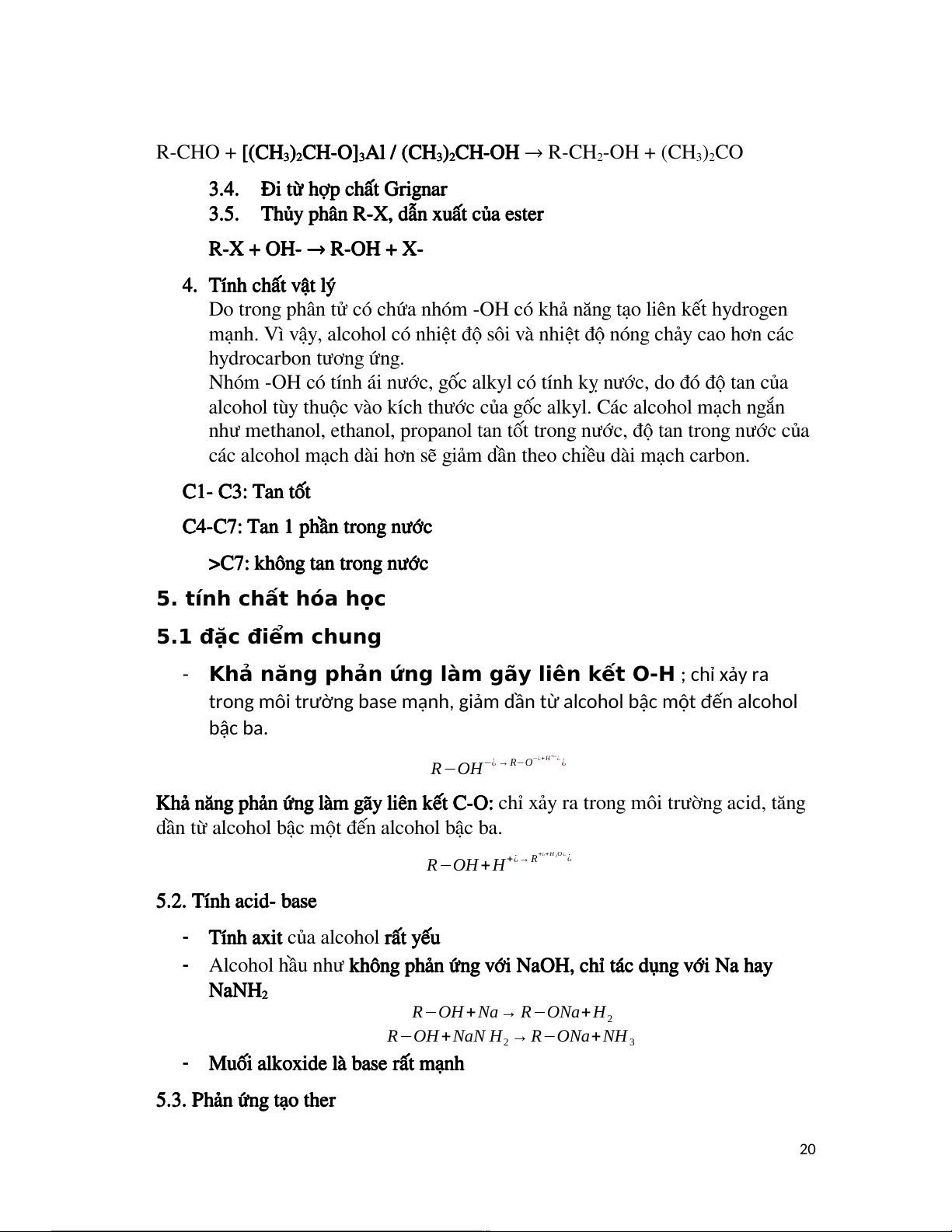Aldehyde → alcohol bậc 1 Ketone → alcohol bậc 2 3.3. 3. 2. 3. 2. Kh K ử h ử bằn g bằn L g i L A i l A H l 4. .N a N BH a 4 4 R-COOH + LiAlH4 → R-CH2-OH R-COOH + LiAlH4 → R+CH2-OH 19 3.3. 3. 3. 3. 3. Kh K ử h ử bằn g bằn [ g ( [ C ( H C 3)2CH C - H O - ] O 3Al Al t r t o r n o g n ( g C ( H C 3)2CH C - H O - H O R-CHO + [( [ C ( H C 3) 3 2C 2 H C - H O - ] O 3Al A / l ( / C ( H C 3)2C 2 H C -O - H O H → R-CH2-OH + (CH3)2CO 3.4. Đi Đ t i ừ t hợ ừ p chấ hợ t p chấ G t r G i r g i n g a n r a 3.5. Thủ T y hủ phân y R phân - R X - , d X ẫ , d n ẫ x n u x ấ u t ấ c t ủ c a ủ e a s e t s e t r e r R- R X - + O X H + O - H → - R → - R O - H O + H X + - X 4. Tí T n í h chất n v h chất ật v l ật ý l
