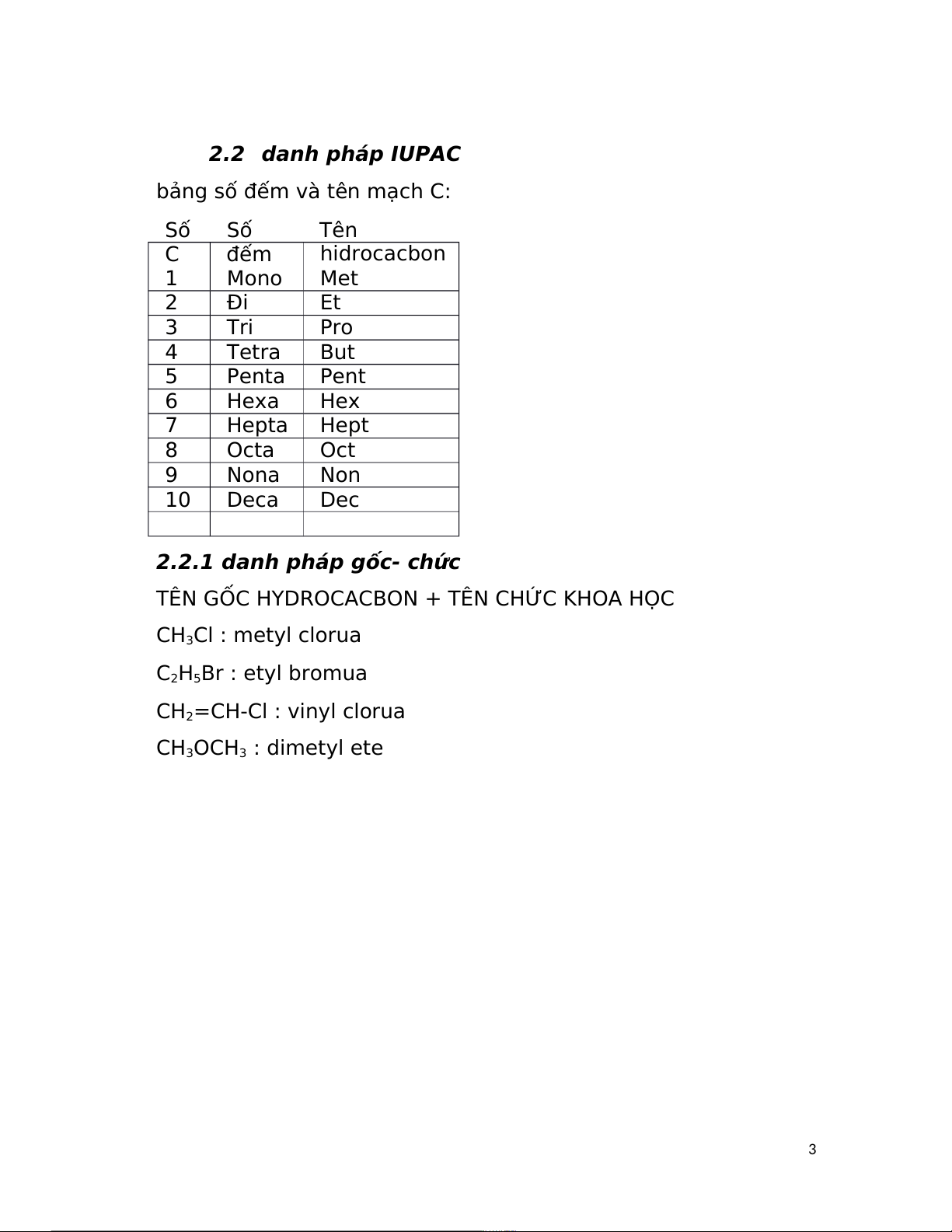 bảng số đếm và tên mạch C: Số Số Tên C đếm hidrocacbon 1 Mono Met 2 Đi Et 3 Tri Pro 4 Tetra But 5 Penta Pent 6 Hexa Hex 7 Hepta Hept 8 Octa Oct 9 Nona Non 10 Deca Dec