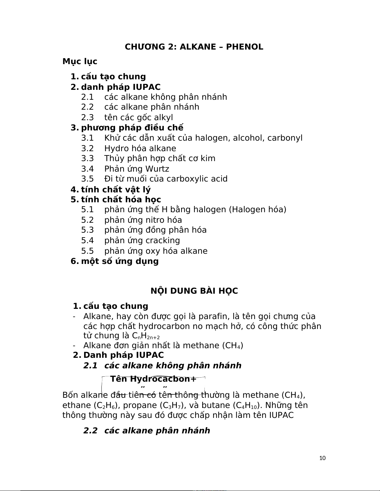 CHƯƠNG 2: ALKANE – PHENOL Mục lục 1. cấu tạo chung 2. danh pháp IUPAC 2.1