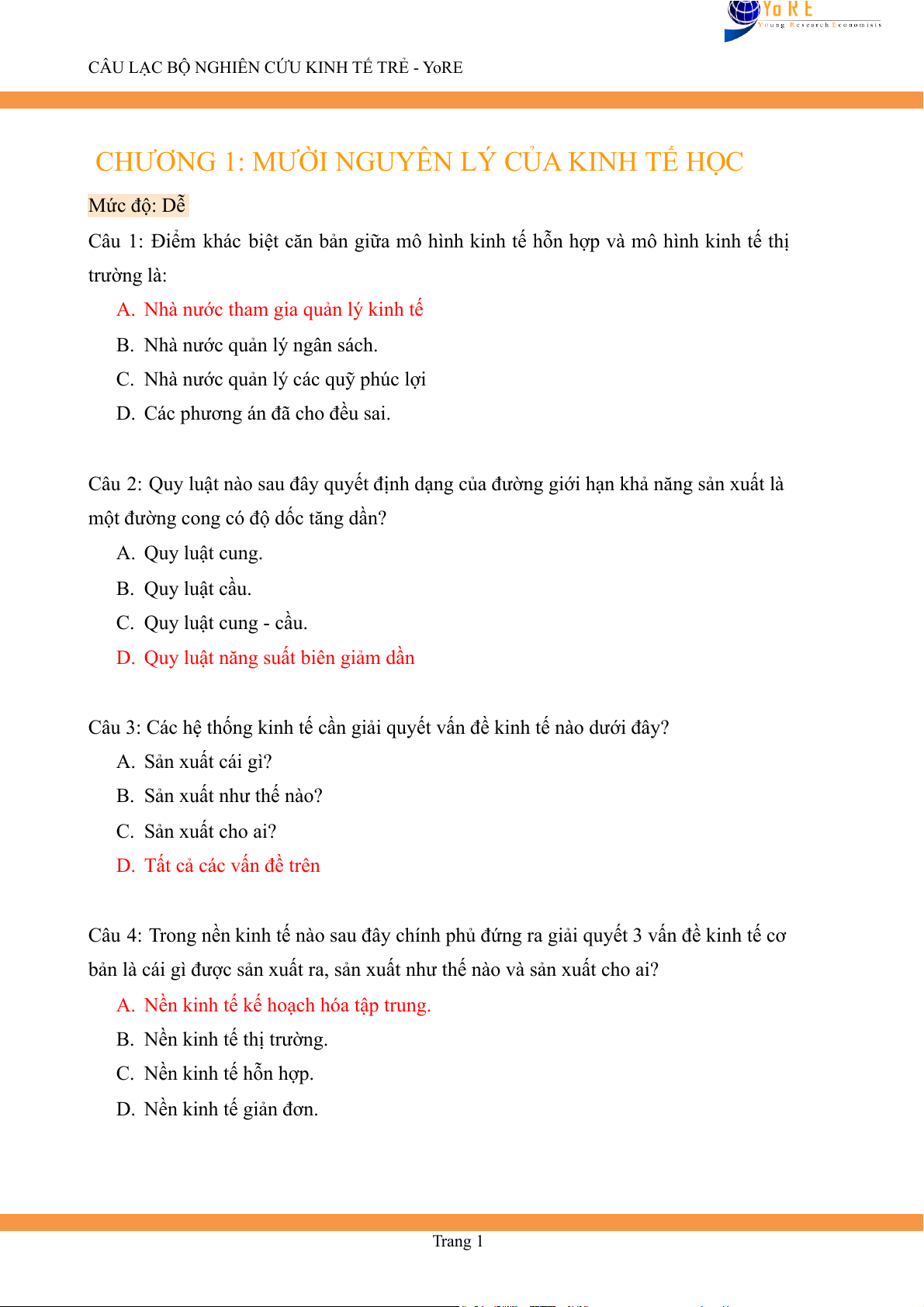 CHƯƠNG 1: MƯỜI NGUYÊN LÝ CỦA KINH TẾ HỌC Mức độ: Dễ