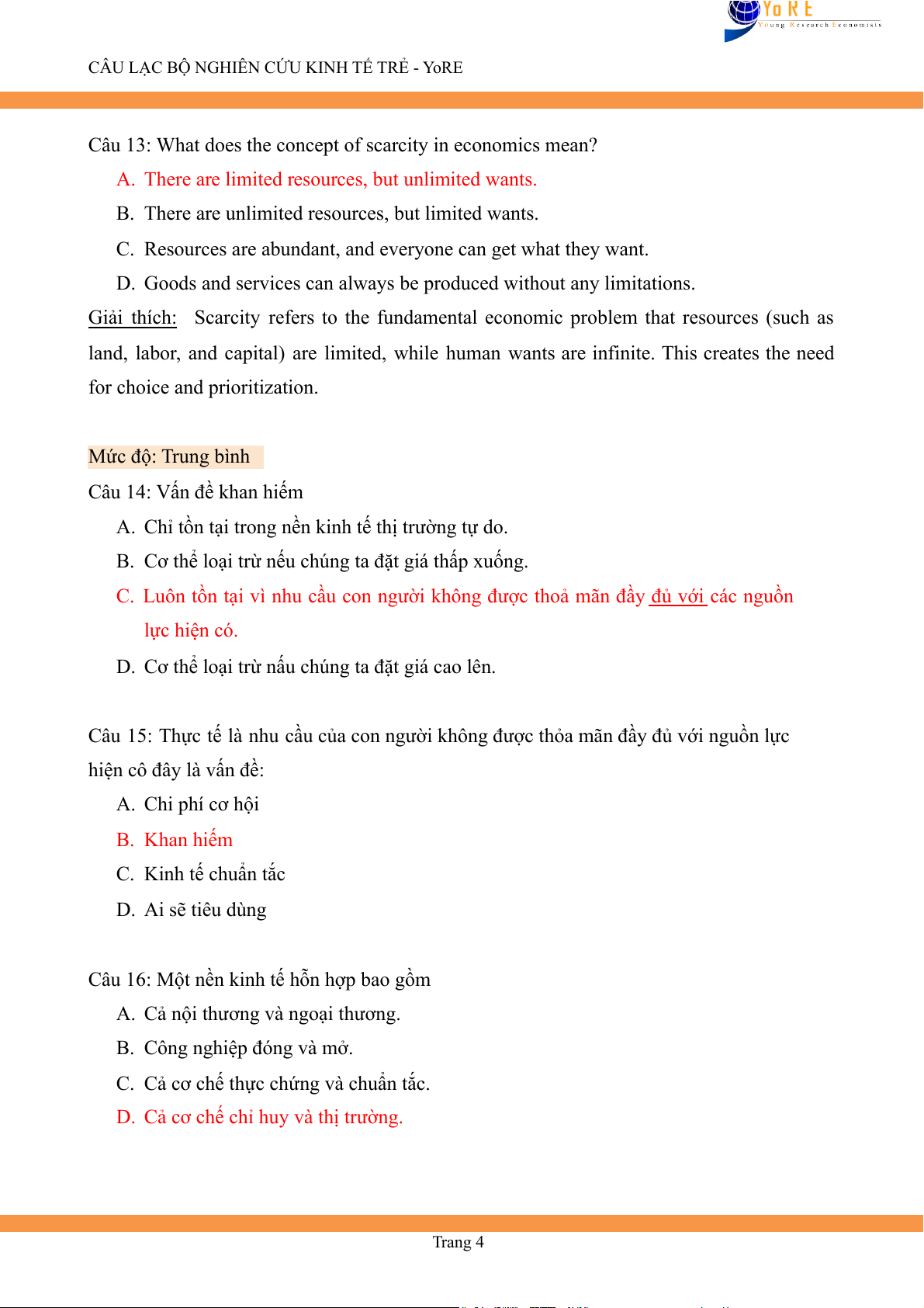 Câu 15: Thực tế là nhu cầu của con người không được thỏa mãn đầy đủ với nguồn lực