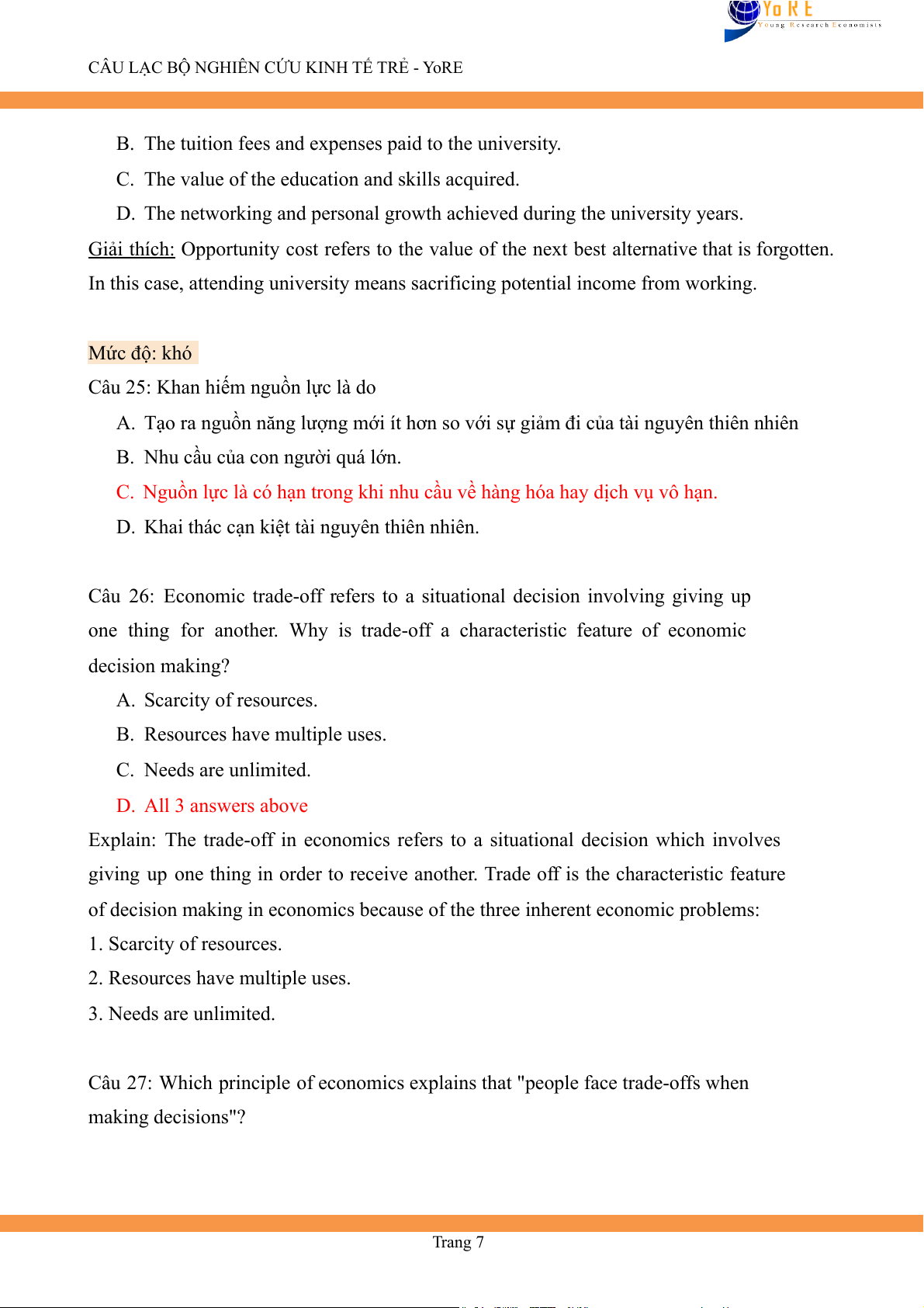 Câu 27: Which principle of economics explains that "people face trade-offs when making decisions"? Trang 7