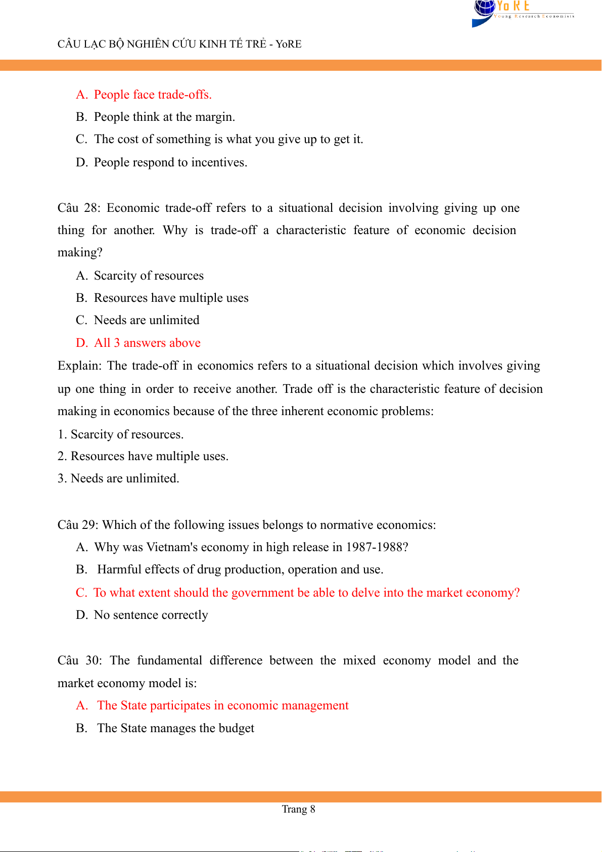 CÂU LẠC BỘ NGHIÊN CỨU KINH TẾ TRẺ - YoRE A. People face trade-offs. B. People think at the margin.