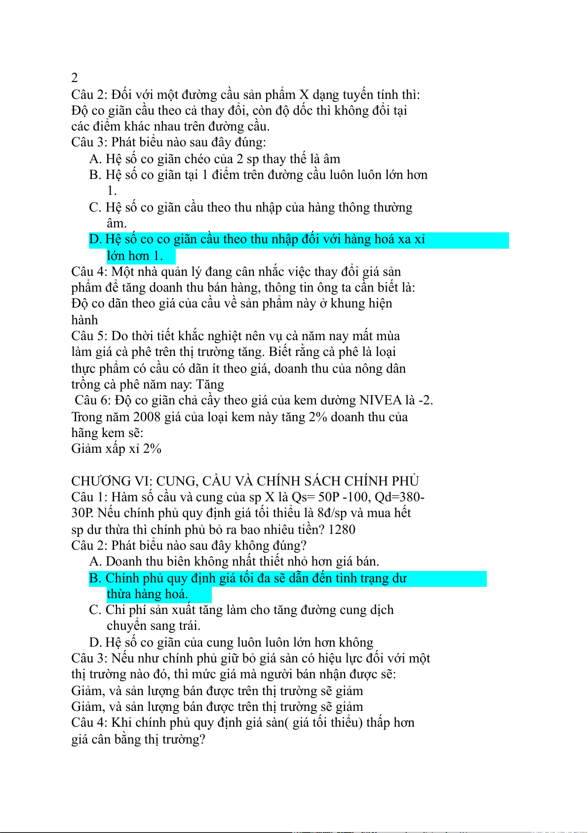 Câu 3: Hàm số cầu là: P=70-2Q, giả sử tăng từ 50 lên 60.