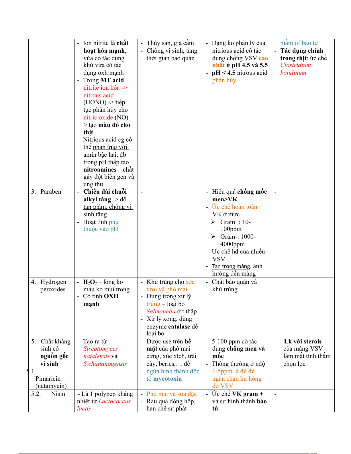 - Được use trên bề - 5-100 ppm có tác - Lk với sterols sinh có Streptomyces mặt của phô mai dụng chống men và của màng VSV nguồn gốc natalensis và cứng, xúc xích, trái mốc làm mất tính thấm vi sinh S.chattanogensis cây, beries,… để - Thông thường ở nđộ chọn lọc 5.1. ngừa hình thành độc 1-5ppm là đủ đẻ Pimaricin tố mycotoxin ngăn chặn hư hỏng (natamycin) do VSV 5.2. Nisin