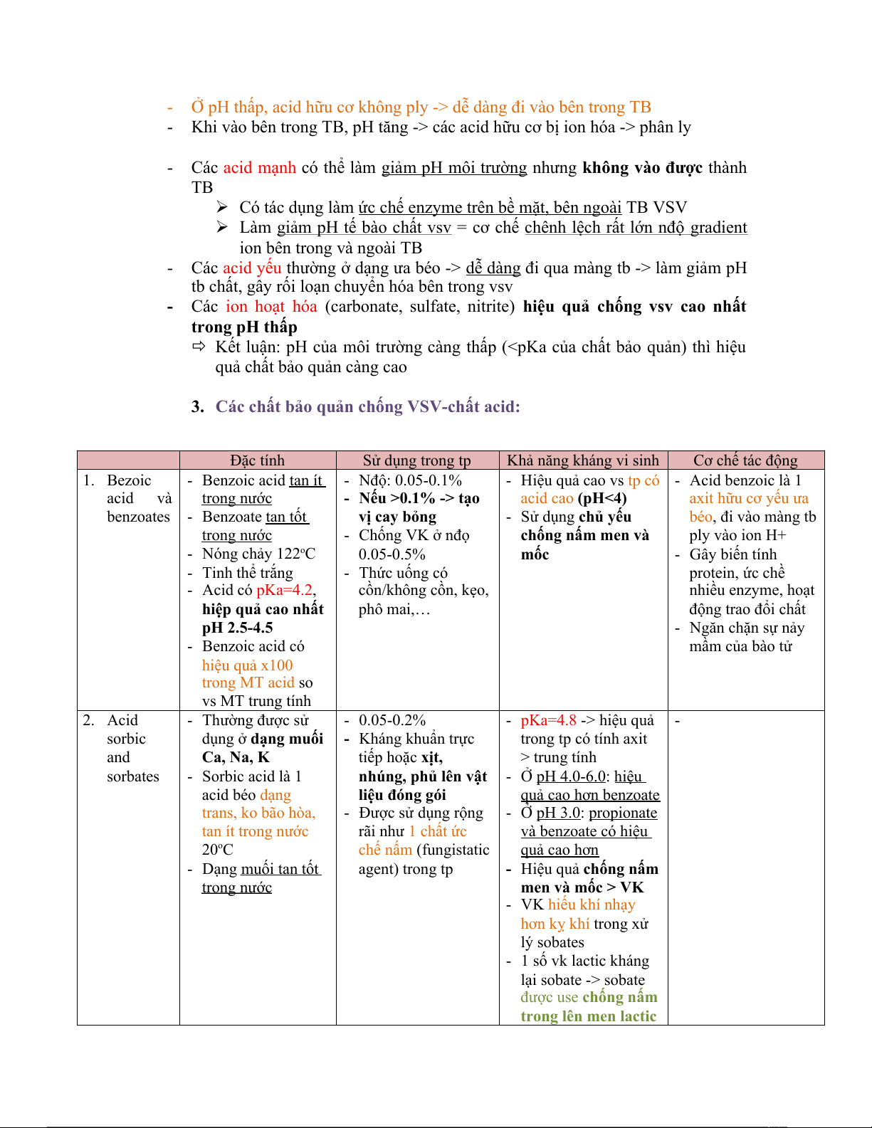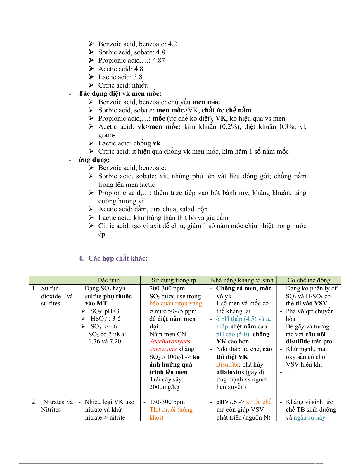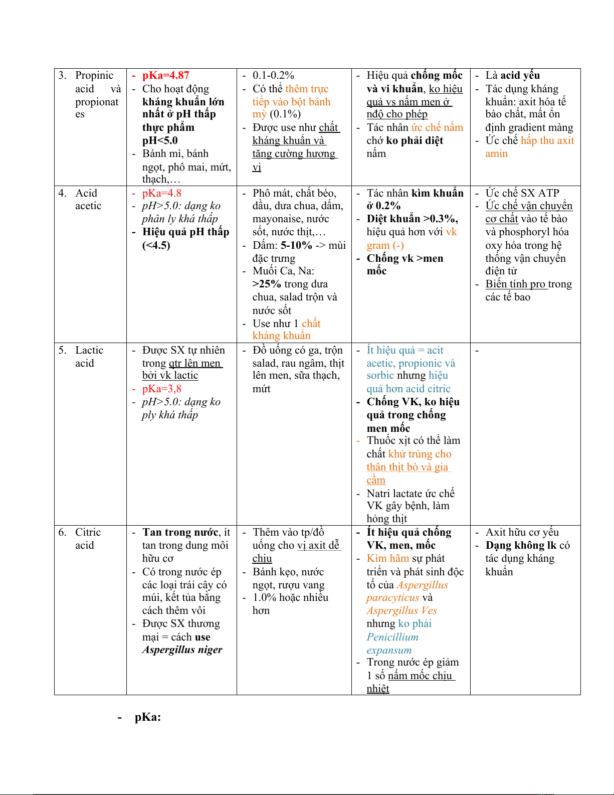 Benzoic acid, benzoate: 4.2 Sorbic acid, sobate: 4.8 Propionic acid,…: 4.87 Acetic acid: 4.8 Lactic acid: 3.8 Citric acid: nhiều