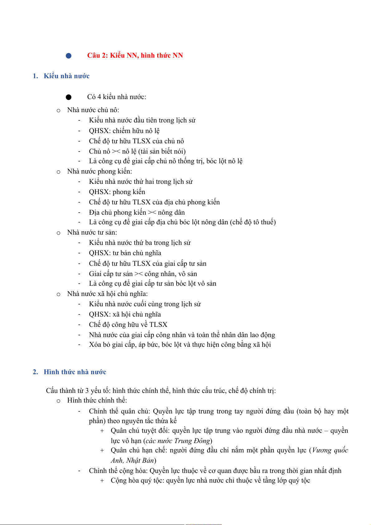 Câu 2: Kiểu NN, hình thức NN 1. Kiểu nhà nước ● Có 4 kiểu nhà nước: o Nhà nước chủ nô: -