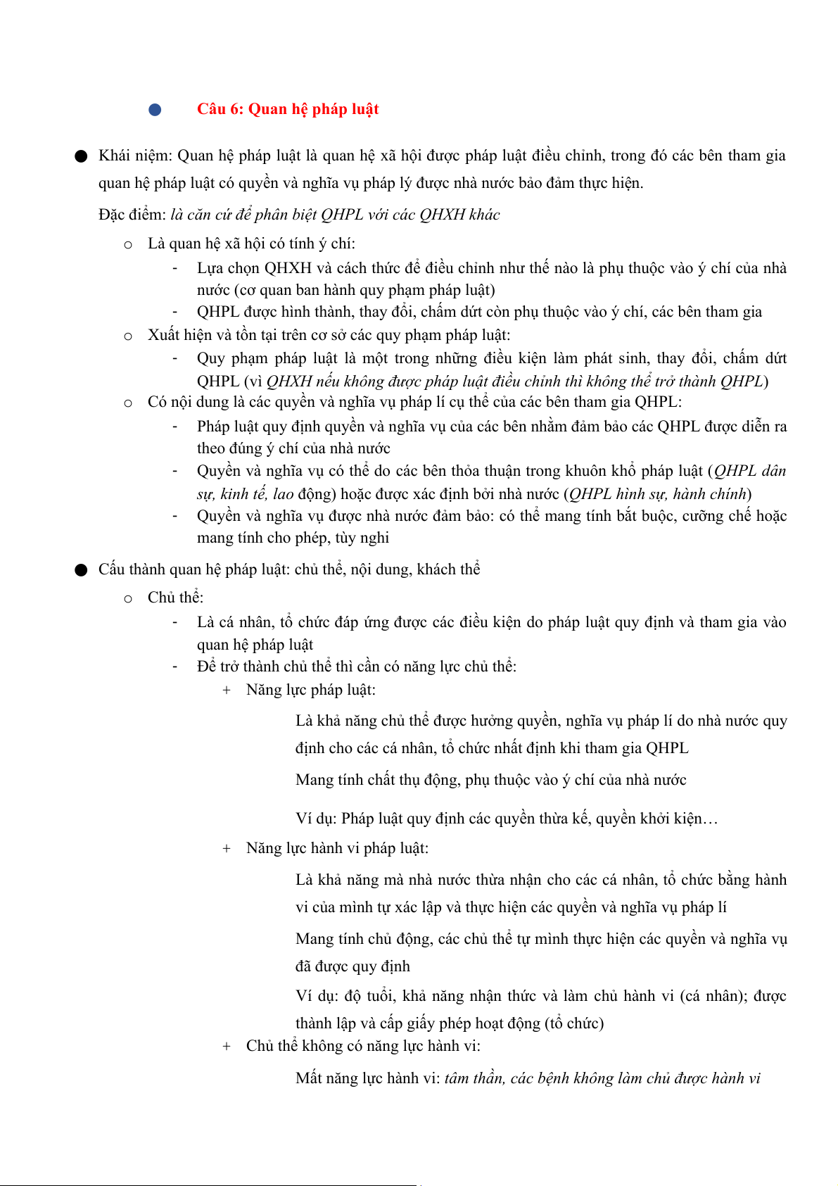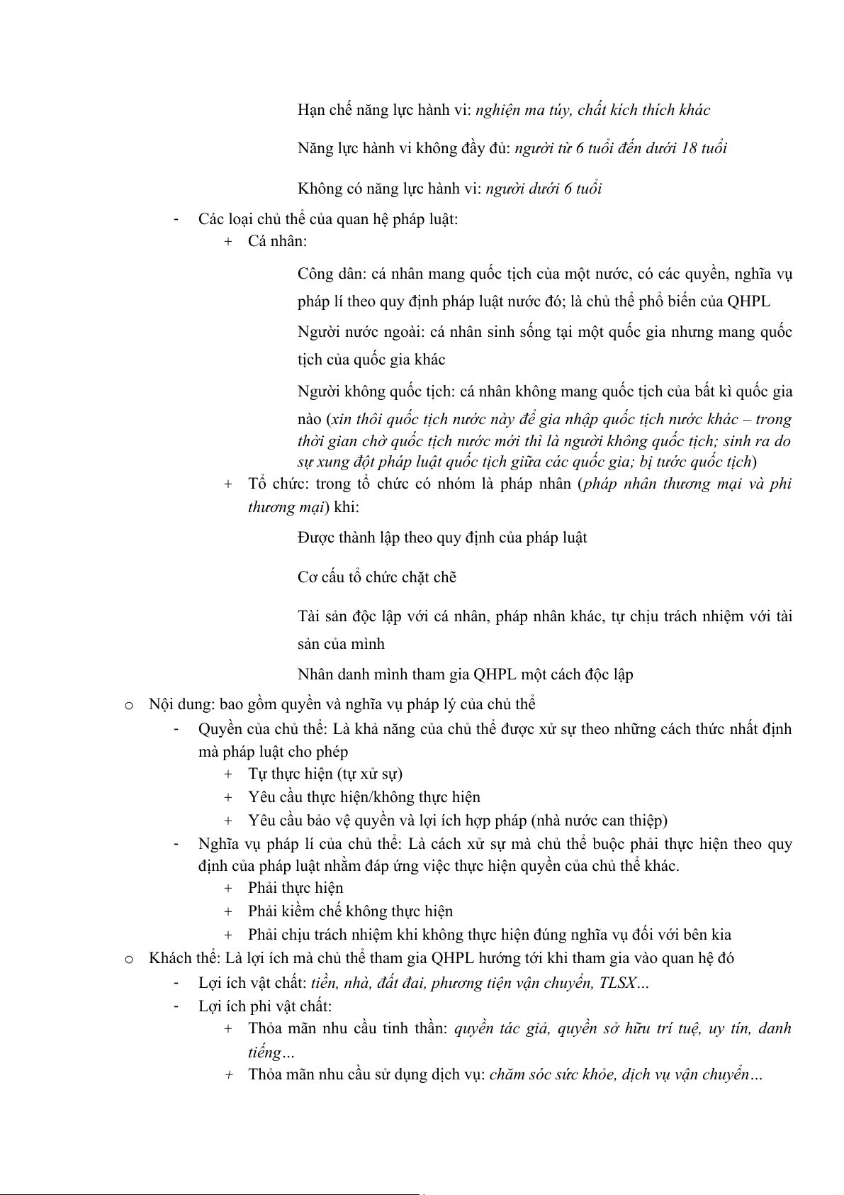 ● Cấu thành quan hệ pháp luật: chủ thể, nội dung, khách thể o Chủ thể: -