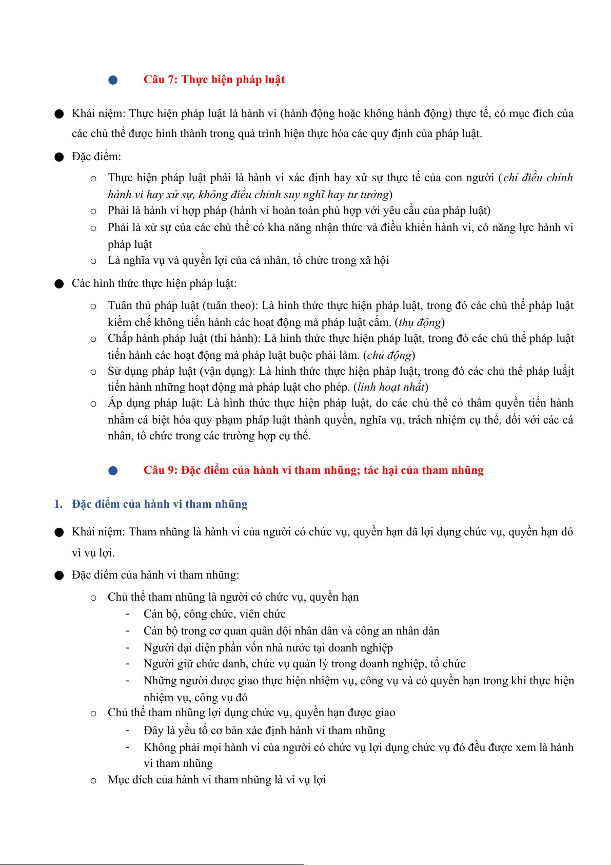 9. Đặc điểm của hành vi tham nhũng; tác hại của tham nhũng II. Lý thuyết: ●