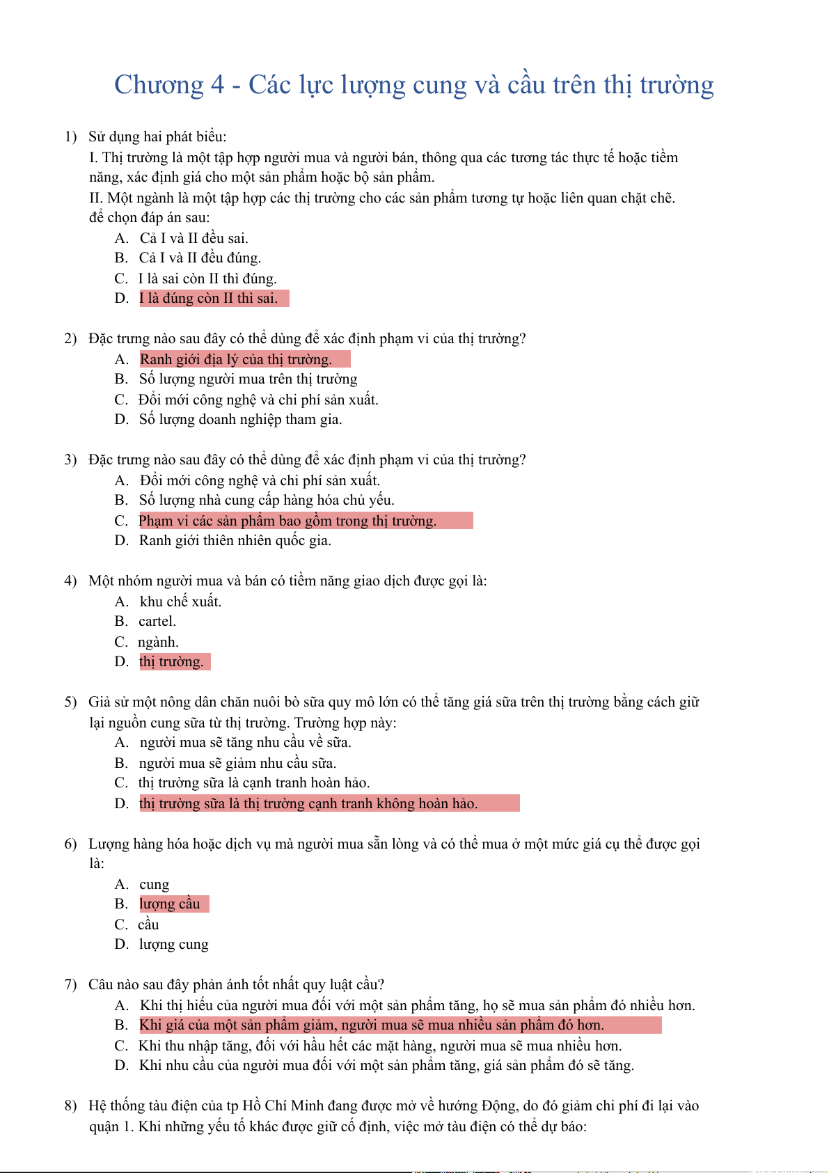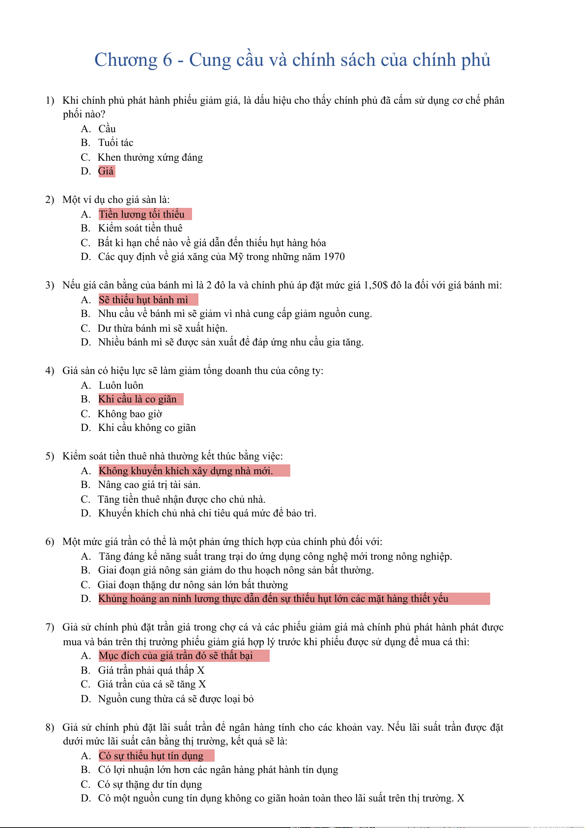 4) Giá sàn có hiệu lực sẽ làm giảm tổng doanh thu của công ty: A. Luôn luôn B. Khi cầu là co giãn C. Không bao giờ D. Khi cầu không co giãn