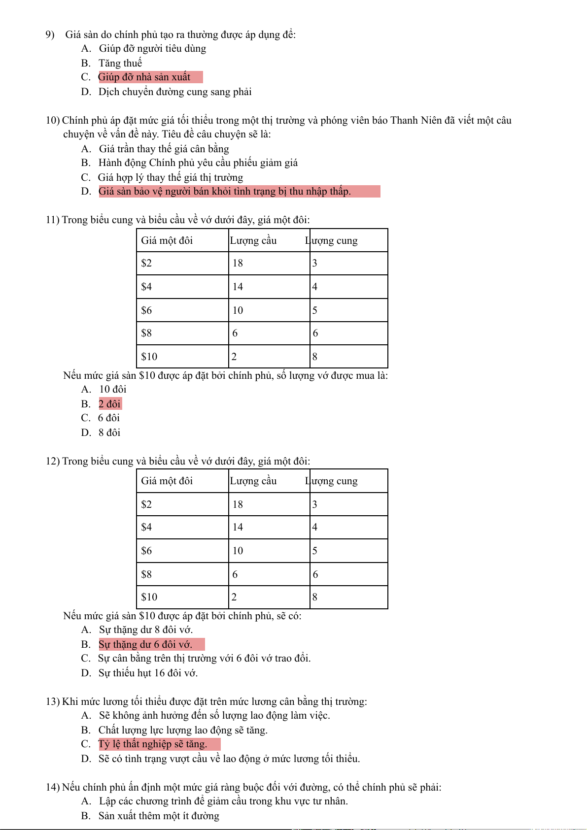 Nếu mức giá sàn $10 được áp đặt bởi chính phủ, số lượng vớ được mua là: A. 10 đôi B. 2 đôi C. 6 đôi D. 8 đôi