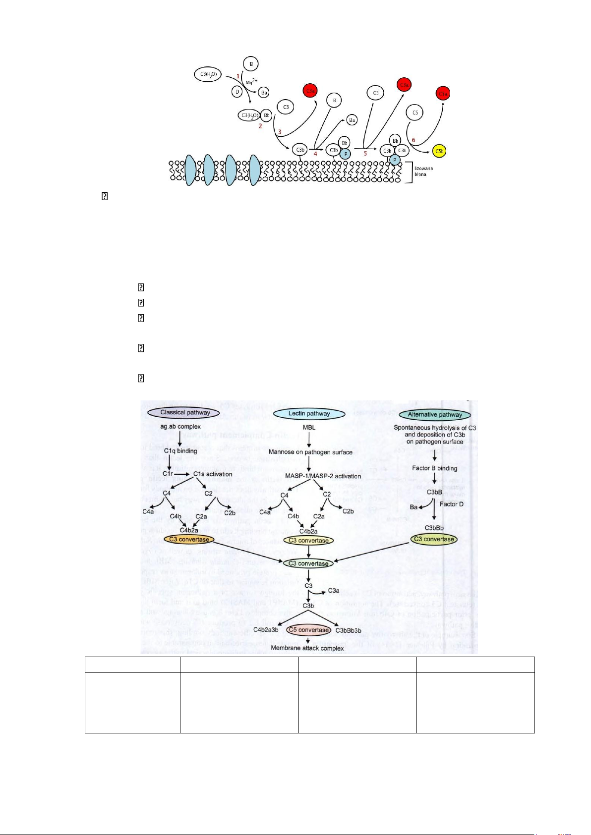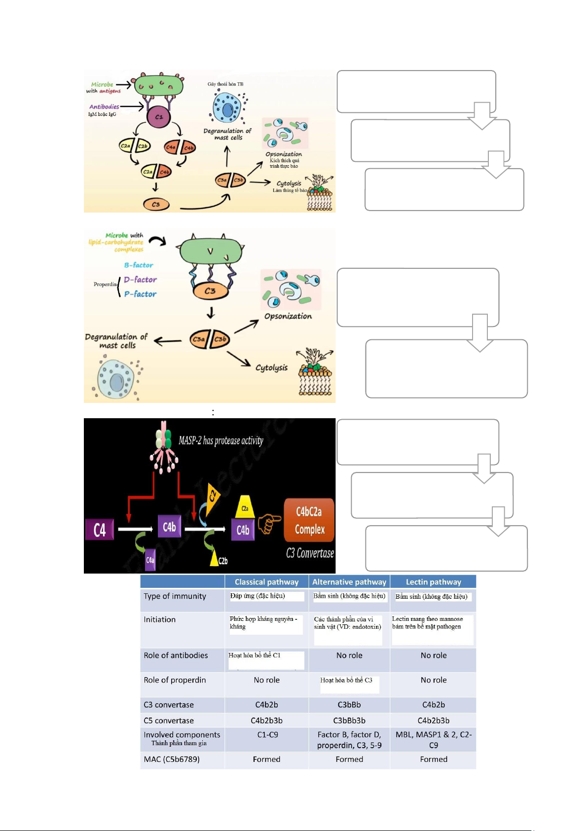 hợp của kháng nguyên các mảnh C3b trên bề vào mannan trên bề với IgM/ IgG mặt đối tượng ngoại mặt vi khuẩn lai Thành phần bổ C1-C9 C3, C5-9 C2-9 thể tham gia Các protein tham Không có Factor B, factor D, MBL, MASP1, gia không phải properdin MASP2 bổ thể Yếu tố kích hoạt C1s Không có MASP1 hoặc MASP2 C2 & C4 C3 convertase C4b2b C4bBbP C4b2b C5 convertase C4b2b3b C4bBbP3b C4b2b3b Sự bền vững của Bị phá vỡ khi có C3 convetase properdin Vai trò