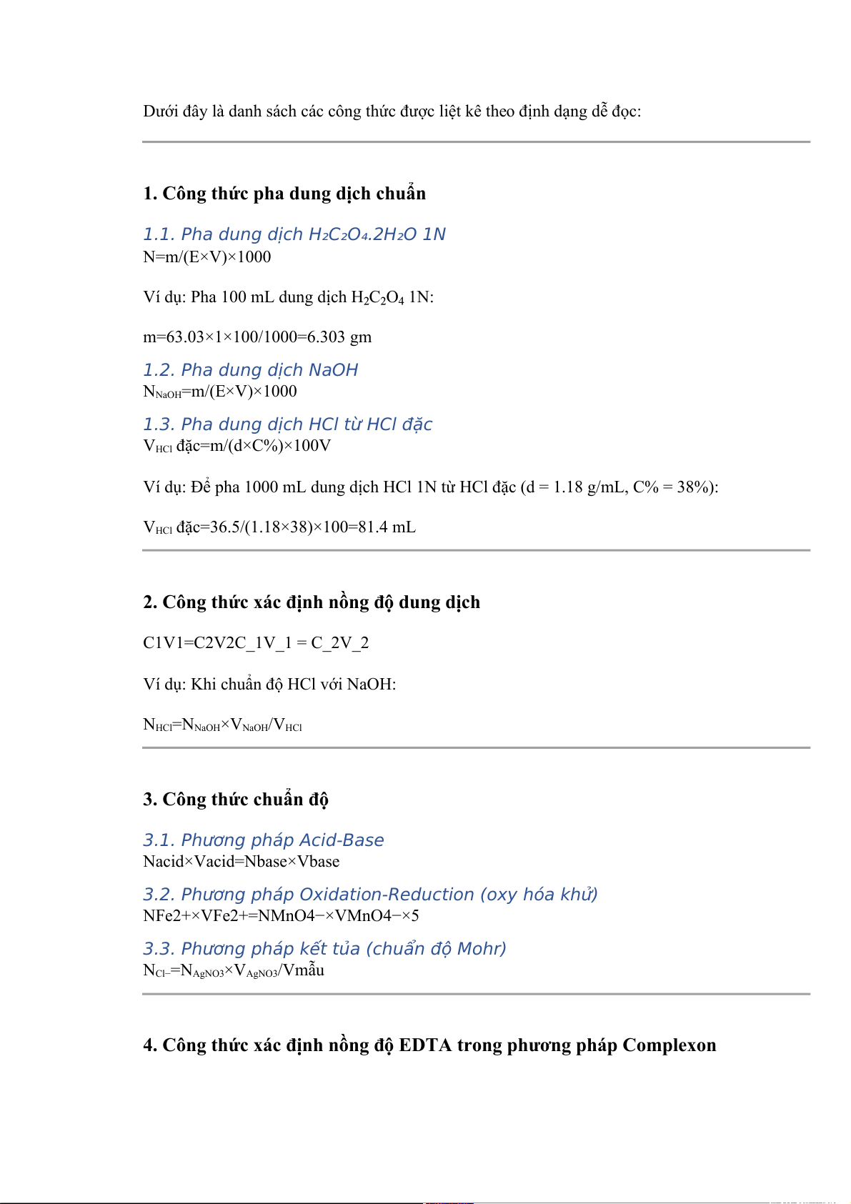 1.1. Pha dung dịch H₂C₂O₄.2H₂O 1N N=m/(E×V)×1000