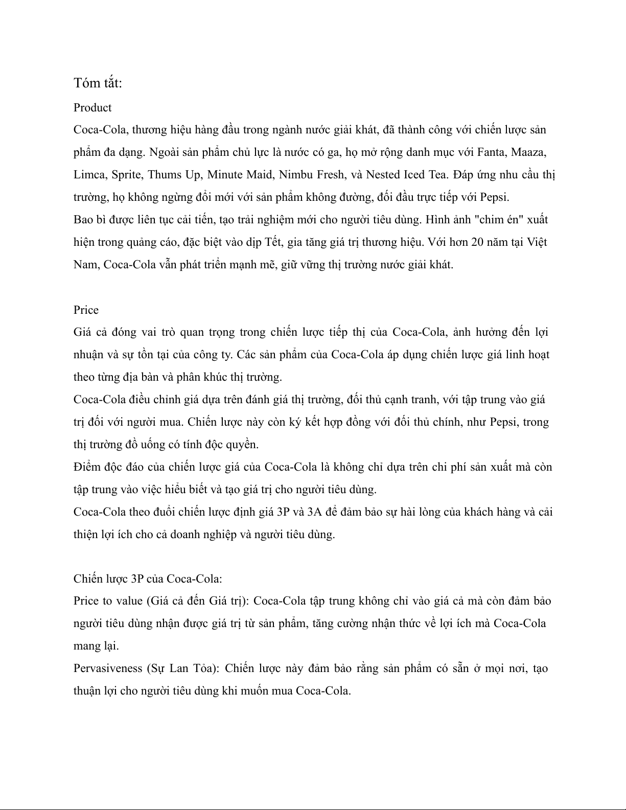 Price to value (Giá cả đến Giá trị): Coca-Cola tập trung không chỉ vào giá cả mà còn đảm bảo