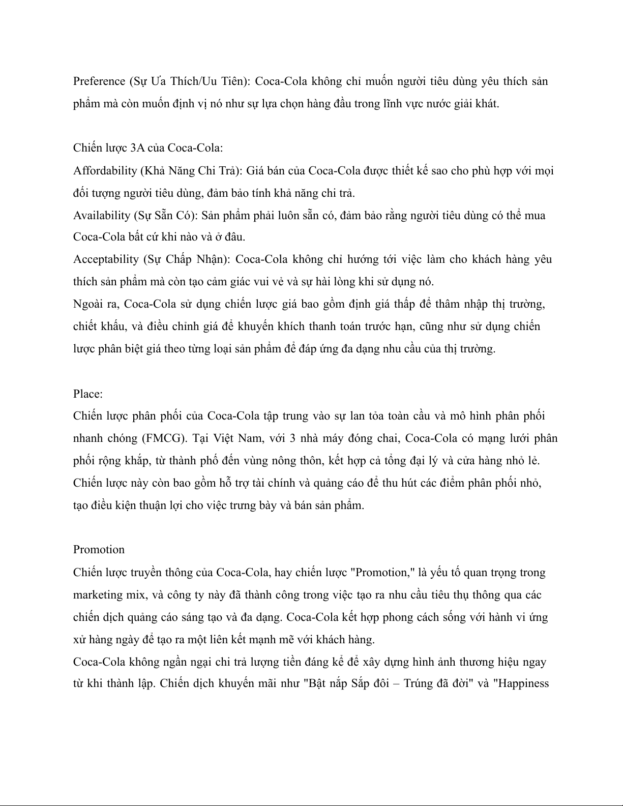 Affordability (Khả Năng Chi Trả): Giá bán của Coca-Cola được thiết kế sao cho phù hợp với mọi