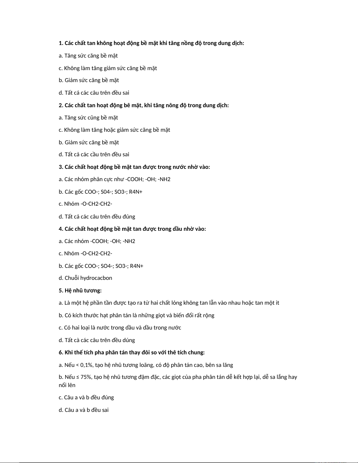 4. Các chất hoạt động bề mặt tan được trong dầu nhờ vào: a. Các nhóm -COOH; -OH; -NH2 c. Nhóm -O-CH2-CH2-